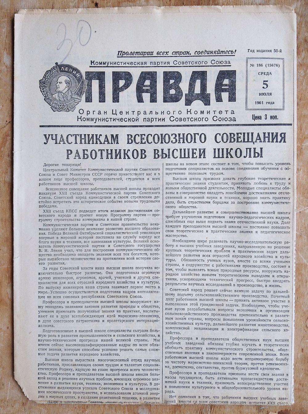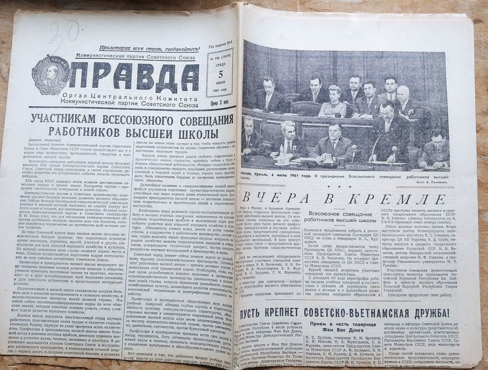 Газета Правда 5 июля 1961 г. Фото Хрущев, Брежнев, Фурцева и др.