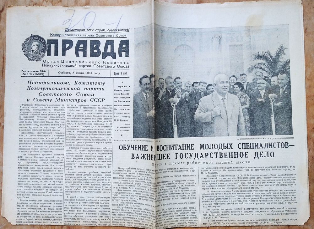 Газета Правда. 8 июля 1961 г. Фото Хрущева Н.С.