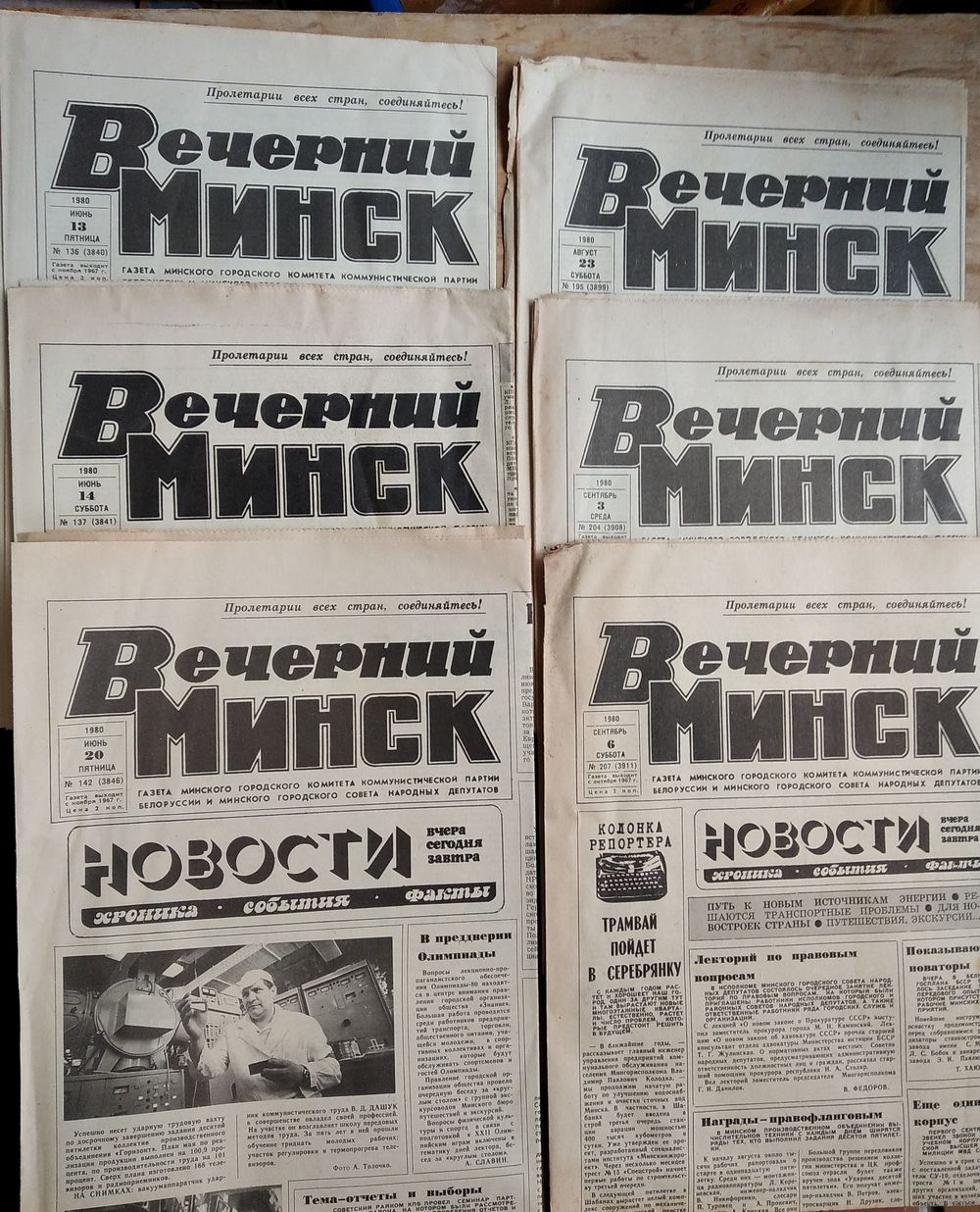 Газета Вечерний Минск. 13, 14, 20 июня, 23 августа, 3, 6 сентября 1980 г. 6 номеров Цена за 1