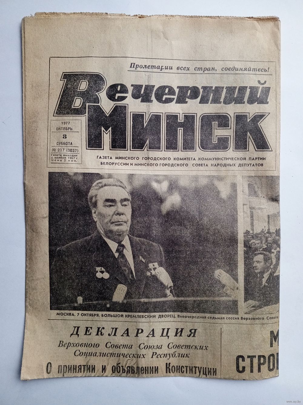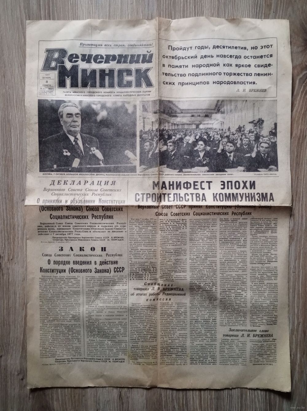 Газета "Вечерний Минск" 8 октября 1977 г. С вкладышем Новая Конституция СССР.