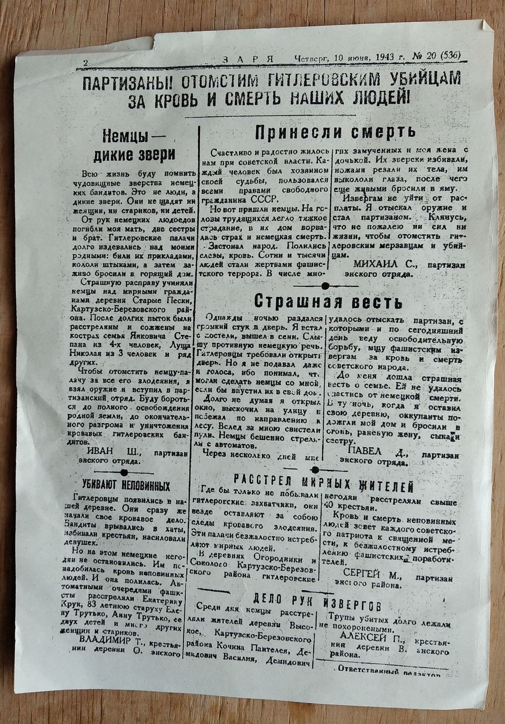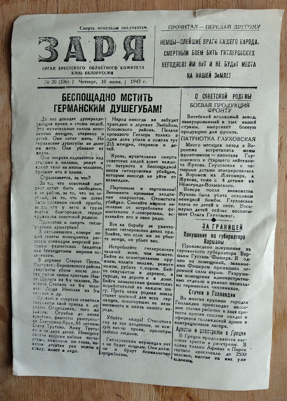 Газета " Заря " Орган Брестского областого комитета КПБ. 10 июня 1943 г. КОПИЯ