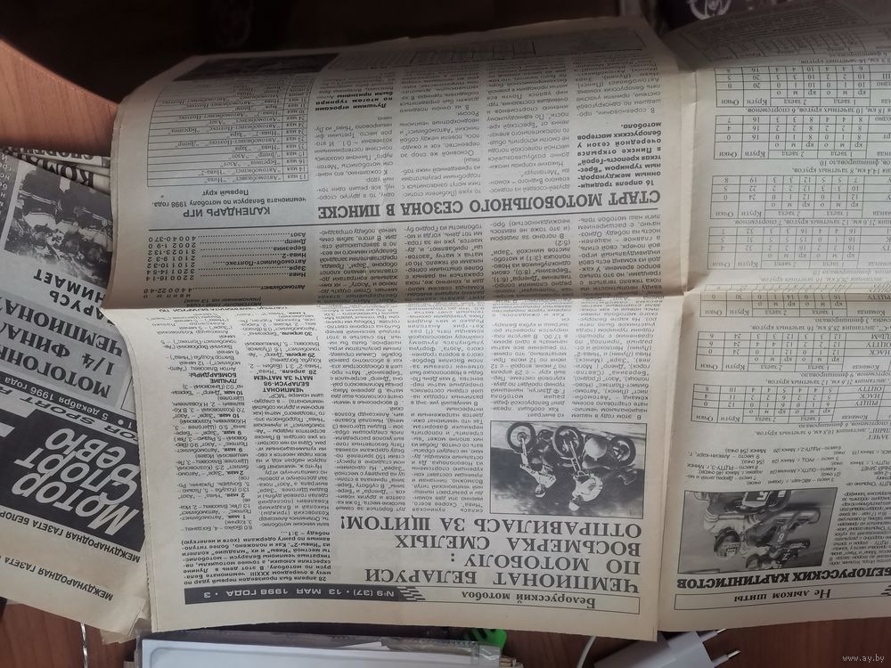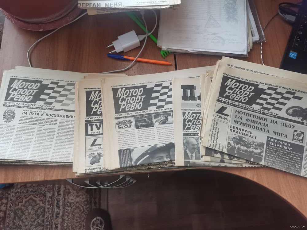 Газеты Мотор.Спорт. Ревю. 1996-1998гг. 36 номеров.В газетах много различной информации по техническим видам спорта. Мотокросс. Автогонки. Формула-1. Мотобол. и др. Газета выпускалась в г Минск. Лотом цена 50 рублей за все 36 номеров. По одному цена за номер 2,50