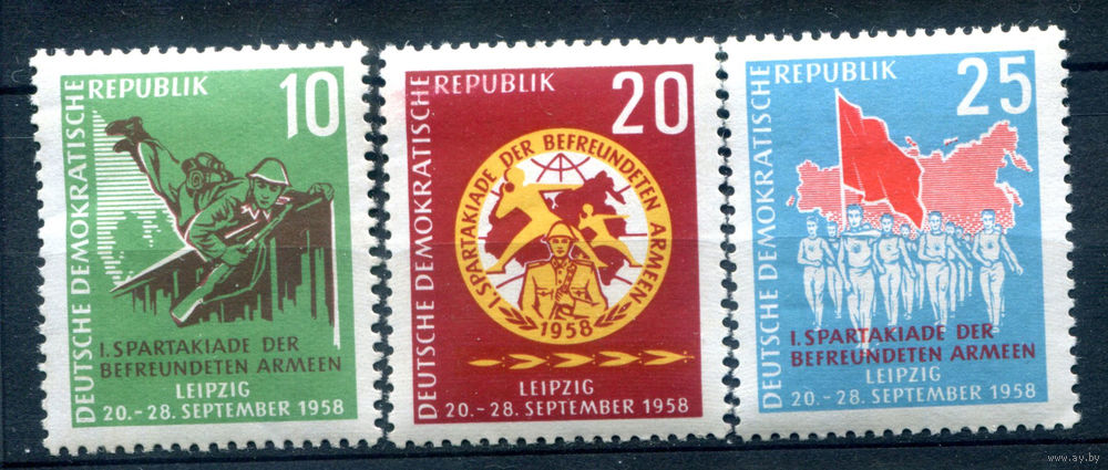 ![ГДР - 1958г. - Первая летняя спартакиада дружественных армий - 3 марки - полная серия, MNH [Mi 657-659]. #1-GG-24-A-1](https://s5-lot.aystatic.by/550x510/769/308/5040/5040308769_0.jpg)