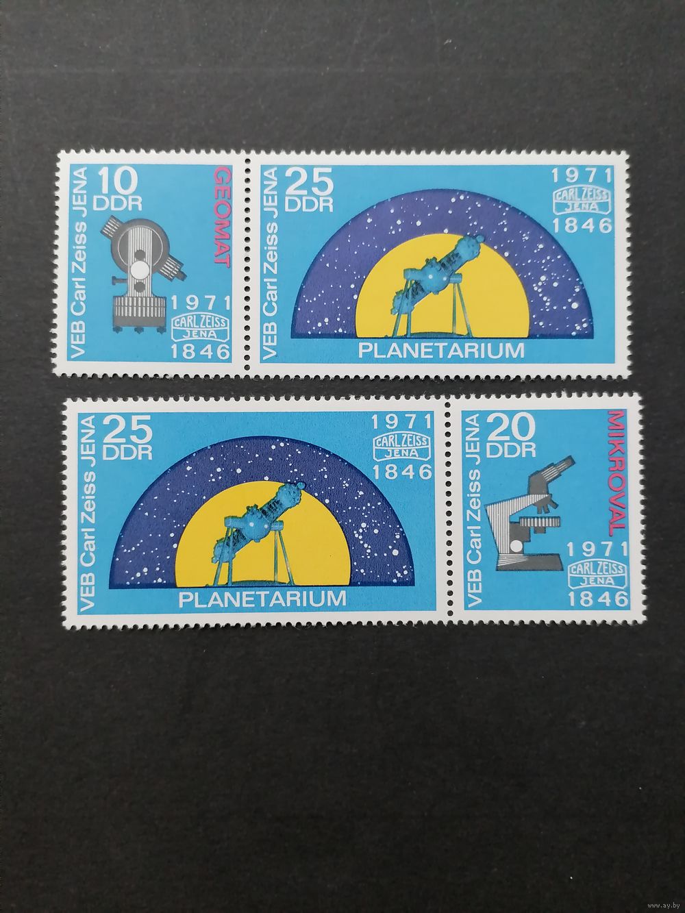 ГДР 1971 Полная серия марок на двух горизонтальных сцепках разной комбинации размещения марок "125 лет предприятию Карл Цейс Йена" (чистые**) Mi.1714-1716 каталог 2.00 евро