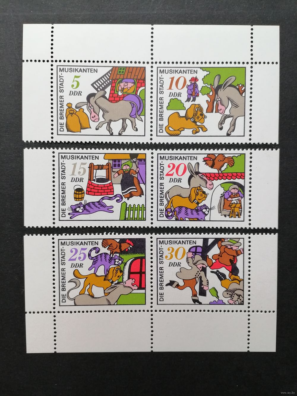 ГДР 1971 Три горизонтальные сцепки из малого листа с полной серией марок "Сказка: Бременские музыканты" (чистый**) Mi.1717-1722 каталог 2.50 евро