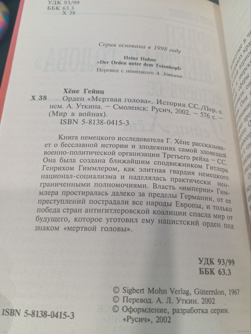 Книга Гейнца Хёне "Орден "Мертвая голова". История СС" — фундаментальное исследование, посвященное самой зловещей военно-политической организации Третьего рейха. Немецкий журналист и историк Гейнц Хёне (1926–2010) на основе архивных документов и свидетельств очевидцев воссоздает историю СС — от небольшой охраны Гитлера до всесильной "империи" Гиммлера, державшей в страхе всю Европу . Издание 2002 года, издательство "Русич" (Смоленск), серия "Мир в войнах".