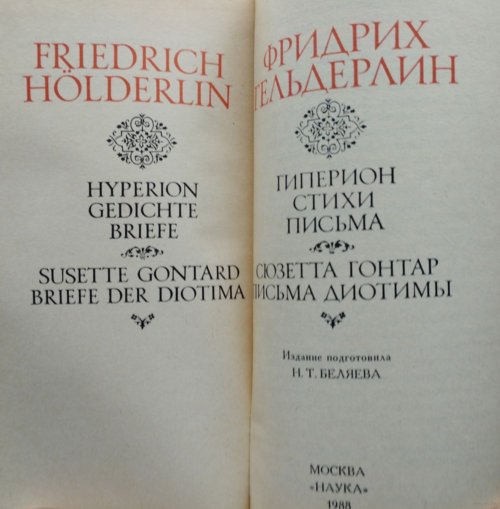 Тираж 25000 экз. 720 стр. "Гиперион" немецкого поэта Фридриха Гельдерлина представляет собой по форме роман в письмах, по стилю - стихотворение в прозе. Гельдерлин задумал роман еще во время учебы в Тюбингене. В 1795 г. в Йене он попробовал переложить написанное в стихи, но скоро вернулся к прозе. В марте он договорился об издании с Коттой, которому его рекомендовал Шиллер, затем завершил роман и написал предисловие. В 1796 г. по совету издателя Гельдерлин сократил текст. Первый том вышел в 1797 г. к пасхальной ярмарке, второй - осенью 1799 г.