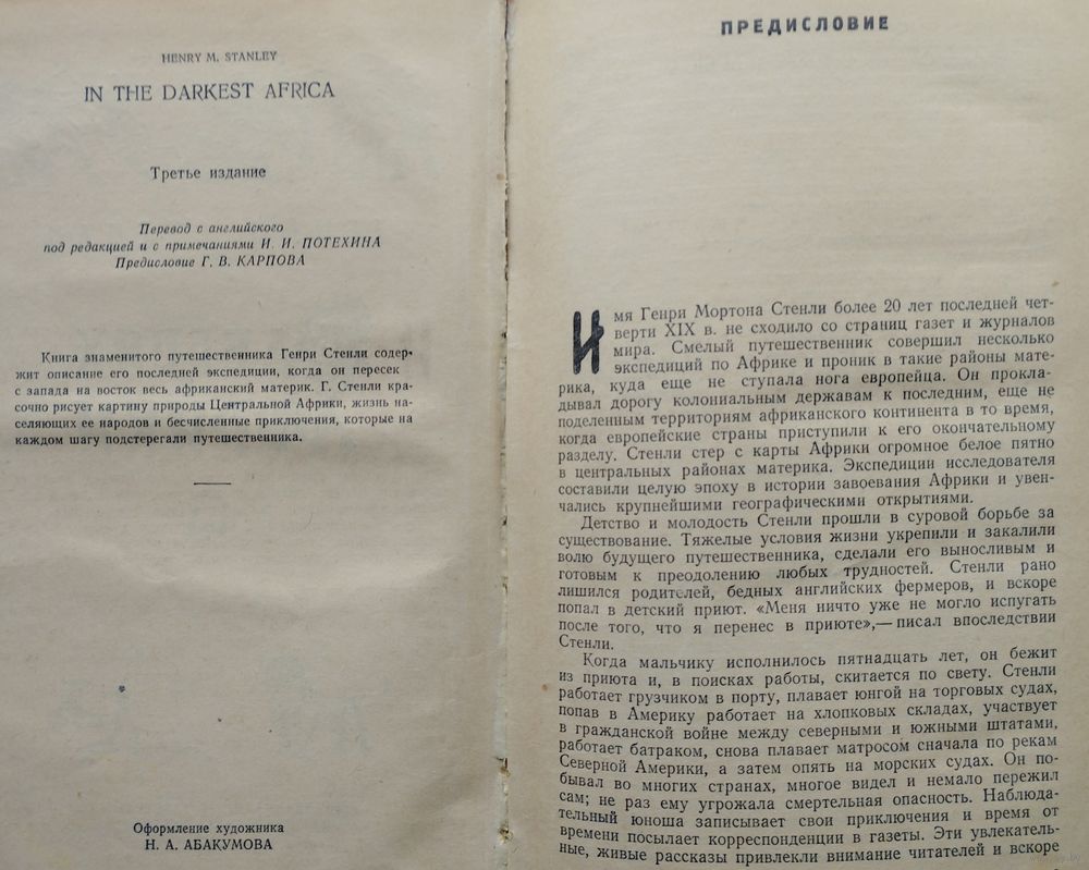 Большой формат. Тираж 50000 экз. 448 стр. Книга известного британского путешественника Генри Мортона Стэнли (1841—1904). "Стэнли назвал свою книгу «In Darkest Africa». Darkest – превосходная степень от слова «dark» (темный, мрачный, тайный, неизведанный), то есть самый мрачный, самый темный и самый неизведанный. Остается только догадываться, какой смысл Стэнли заложил в столь разнообразно трактуемое слово «darkest». Ранние переводчики на русский язык почему-то использовали название «В дебрях Африки», хотя в оригинале слово «дебри» отсутствовало. У меня возникла проблема: озаглавить как «В самой мрачной Африке» или «В самой неизведанной Африке». Слово «самой» показалось для названия неподходящим. Так как в экспедиции погибли и умерли от голода, более 300 человек, слово «мрачная» показалось наиболее приемлемым. В то же время маршрут экспедиции проходил по большей части через неисследованные или мало исследованные территории; поэтому слово «неизведанная» также подходило. В конце концов, я остановился на варианте «В мрачной и неизведанной Африке», сам несколько погрешив против названия, данного книге Генри Мортоном Стэнли, но, по-моему, сохранив заложенный автором смысл." (примечание переводчика).