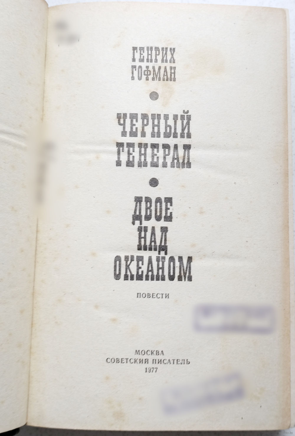 В книгу Генриха Гофмана вошли повести "Черный генерал" и "Двое над океаном". Созданная на документальном материале повесть "Черный генерал" посвящена интернациональной борьбе чехов, словаков и представителей многонационального Советского Союза против фашизма. Два мира, две классовые идеологии предстают перед читателем и в повести "Двое над океаном". С психологической достоверностью и остротой Г.Гофман изображает перипетии жизни Михаила Волкова - человека, путем представительства попавшего за границу, становящегося агентом ЦРУ и, в конце концов, претерпевающего полное моральное фиаско.
