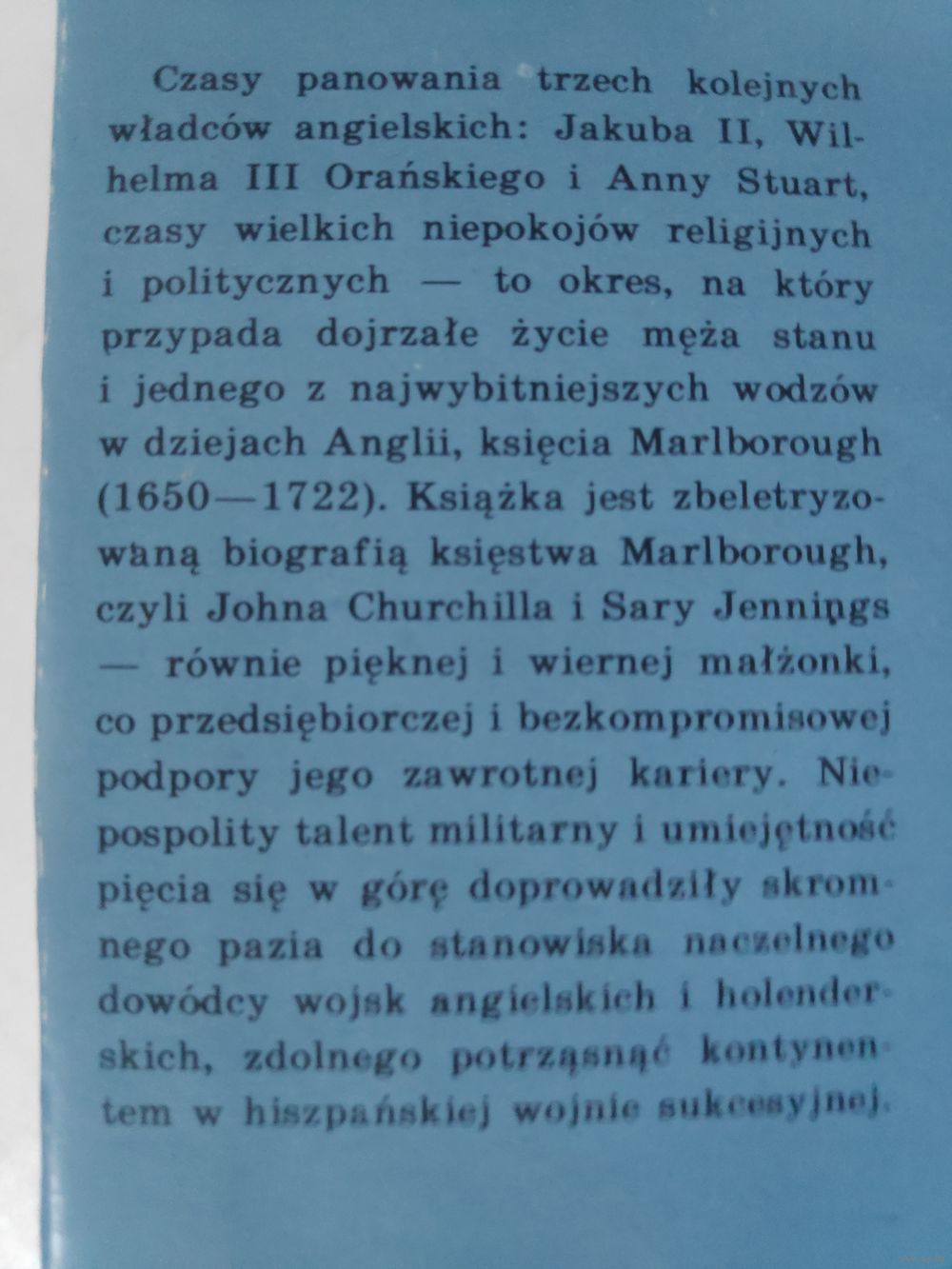 Czasy panowania trzech kolejnych władców angielskich: Jakuba II, Wilhelma III Orańskiego i Anny Stuart, czasy wielkich niepokojów religijnych i politycznych - to okres na który przypada dojrzałe życie męża stanu i jednego z najwybitniejszych wodzów w dziejach Anglii, księcia Marborough (1650-1722). Książka jest zbeletryzowaną biografią księstwa Marlborough, czyli Johna Churchilla i Sary Jennings - równie pięknej i wiernej małżonki, co przedsiębiorczej i bezkompromisowej podpory jego zawrotnej kariery. Niepospolity talent militarny i umiejętność pięcia się w górę doprowadziły skromnego pazia do stanowiska naczelnego dowódcy wojsk angielskich i holenderskich, zdolnego potrząsnąć kontynentem w hiszpańskiej wojnie sukcesyjnej.