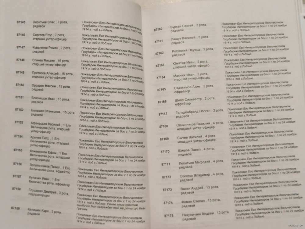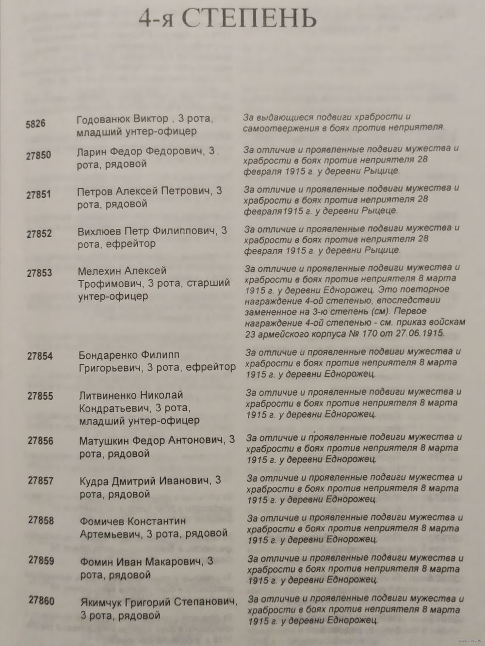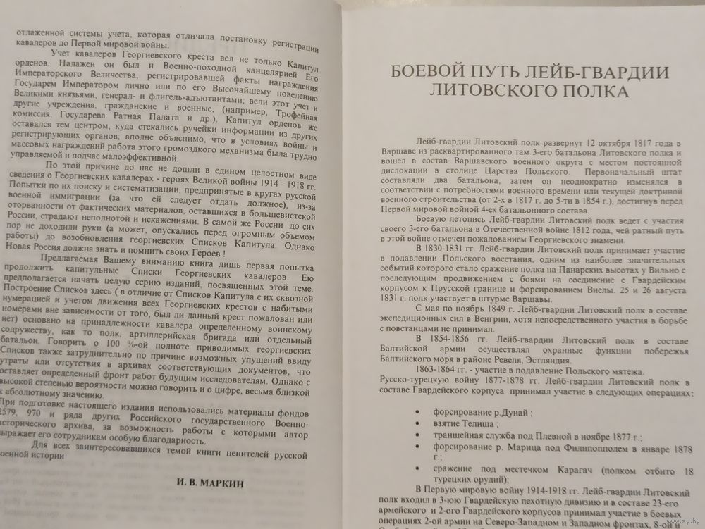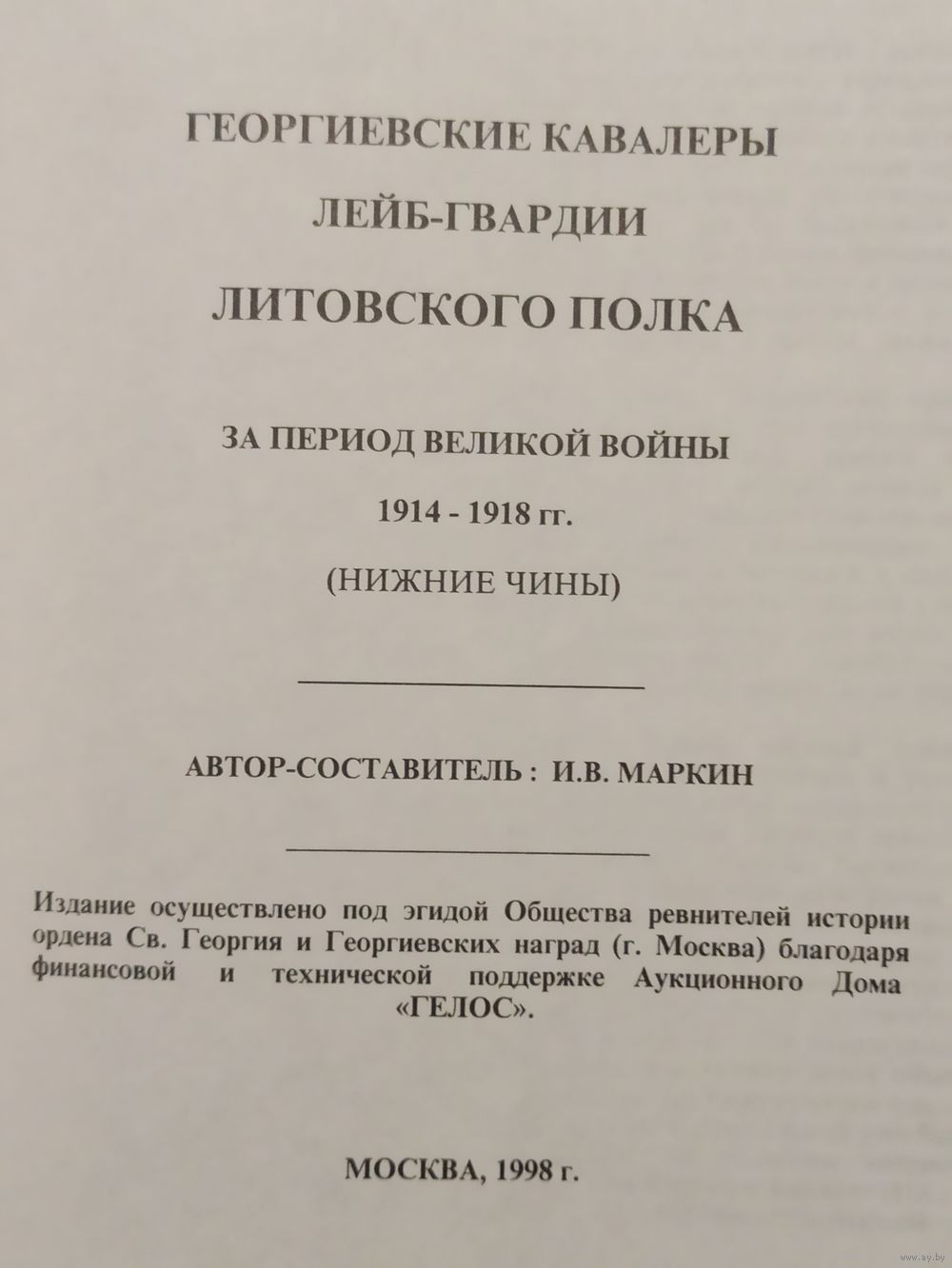 «Георгиевские кавалеры Лейб-гвардии Литовского полка за период Великой войны 1914-1918 гг. (нижние чины)», автор-составитель И.В. Маркин, изданна в 1998 году. Построение Списков здесь (в отличие от Списков Капитула с их сквозной нумерацией и учетом движения всех Георгиевских крестов с набитыми номерами вне зависимости от того, был ли данный крест пожалован или нет) основано на принадлежности кавалера определенному воинскому содружеству, как то полк, артиллерийская бригада или отдельный батальон. Говорить о 100 %-ой полноте приводимых георгиевских Списков также затруднительно по причине возможных упущений ввиду утраты или отсутствия в архивах соответствующих документов, что оставляет определенный фронт работ будущим исследователям. Однако с высокой степенью вероятности можно говорить и о цифре, весьма близкой к абсолютному значению.
