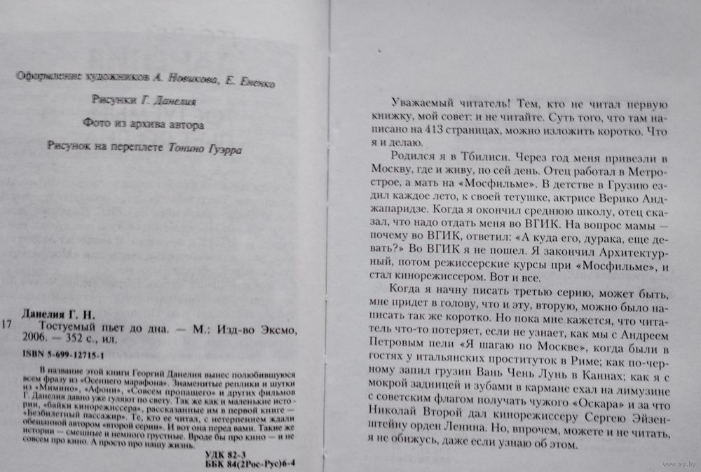 Тираж 5100 экз. 352 стр. В мемуарах знаменитого кинорежиссера `Тостуемый пьет до дна` с большим юмором рассказывается о происходившем `за кулисами` кинопроизводства в СССР. В эту книгу вошли `две серии` автобиографической прозы знаменитого кинорежиссера. В ожидании обещанной автором `третьей серии` вниманию читателей предлагается новая книга. Тех, кто еще не знаком с маленькими историями, рассказанными Георгием Данелией, - `Безбилетный пассажир` и `Тостуемый пьет до дна`, можно поздравить - их ждет чтение достойное, умное, смешное и грустное одновременно - как и все фильмы Георгия Данелия. Ну а тем, кто их уже читал, будет приятно иметь обе любимыче книги под одной обложкой.