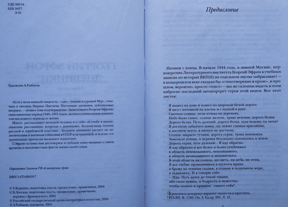 Большой формат. Тираж 3000 экз. 568 стр. «Есть у меня важный свидетель — сын», «умный и суровый Мур», — отмечала в письмах Марина Цветаева. Настоящие дневники, публикуемые впервые, — лучшее тому подтверждение. Записи юного Георгия Эфрона, охватывающие период 1940—1941 годов, являются уникальным документом последнего периода ее жизни. Много рассказывает молодой человек и о себе: об учебе в школе, занятиях рисованием, встречах с девушками, бесконечном чтении русской и зарубежной классики... Большое внимание уделяет он политическим и военным событиям в СССР и за границей, и подчас его правильные прогнозы вызывают изумление. Г. Эфрон оставил нам достоверное и глубокое повествование о своем времени и малоизвестных фактах жизни своей семьи.