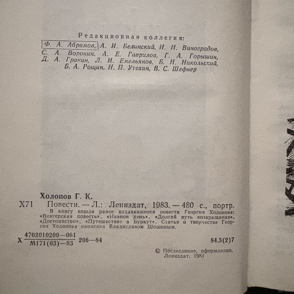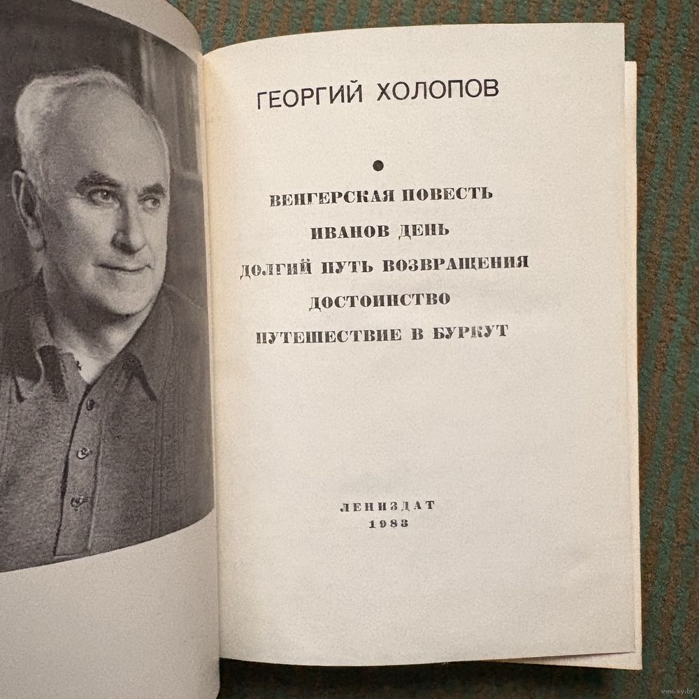 Повести. - Л.: Лениздат, 1983. - 480 с., портр.В книгу вошли ранее издававшееся повести Георгия Холопова: «Венгерская повесть», «Иванов день», «Долгий путь возвращения», «Достоинство», «Путешествие в Буркут». Статья о творчестве Георгия Холопова написана Владиславом Шошиным.Послесловие, оформление, Лениздат, 1983.