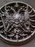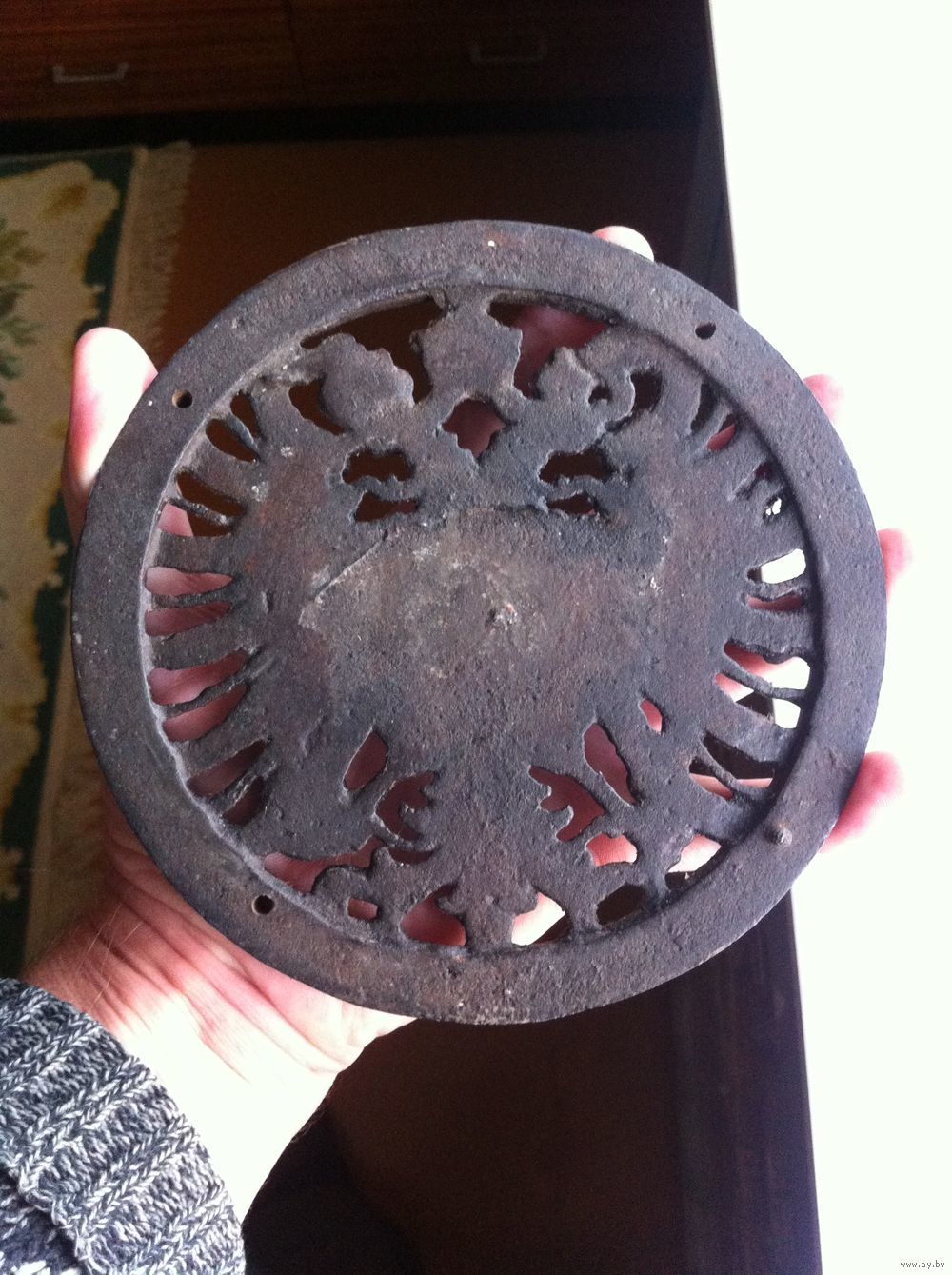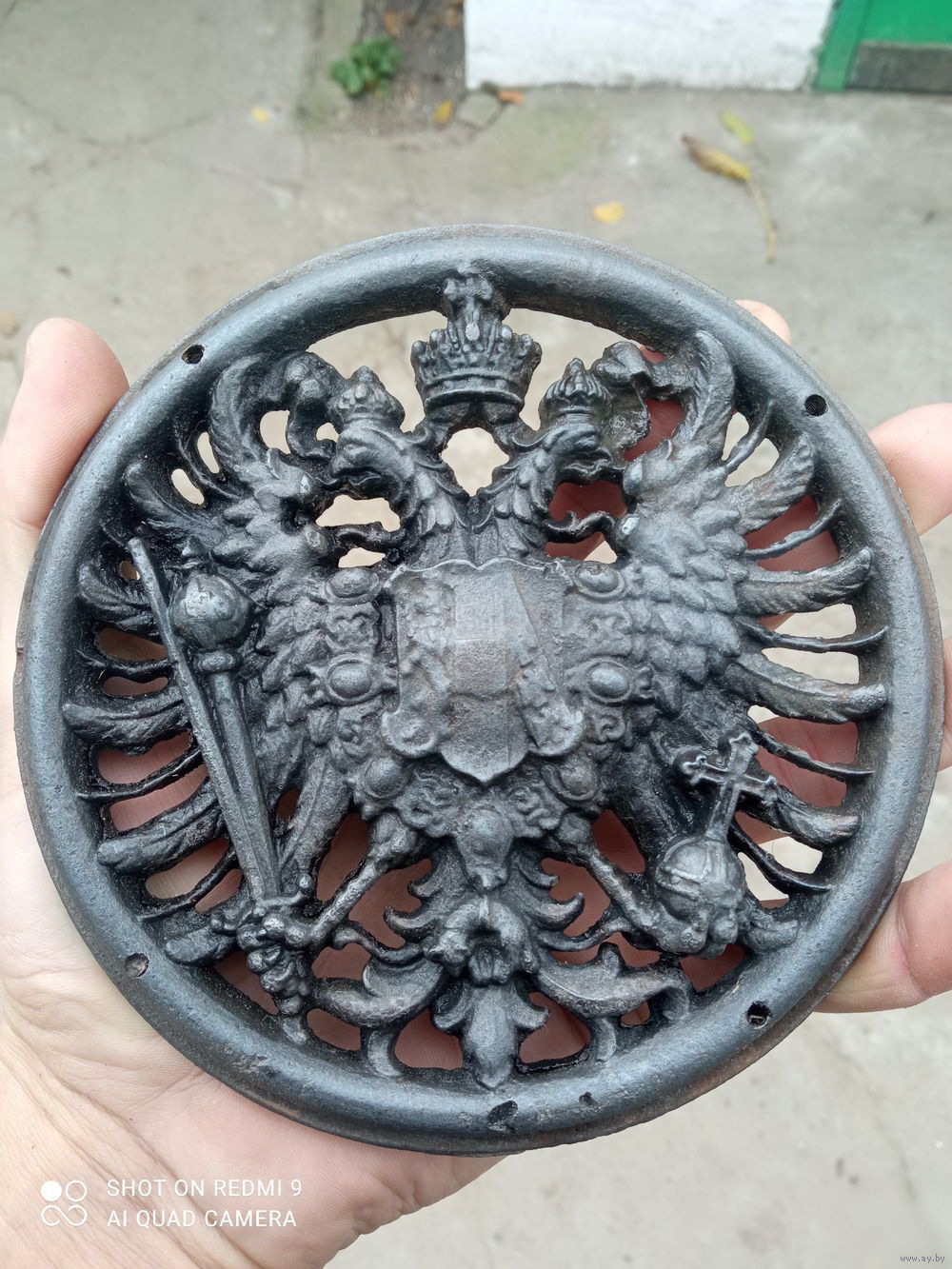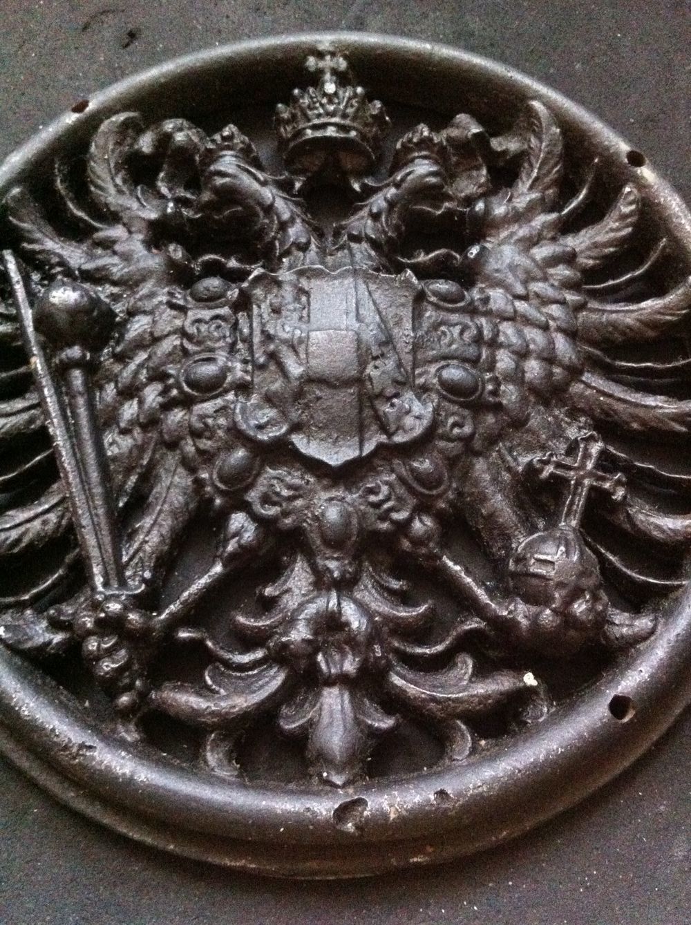 - ГЕРБ Австро-Венгрии 1867-1918 Чугун Д 15 см 750 гр с пулевой меткой войны Накладка Плакетка