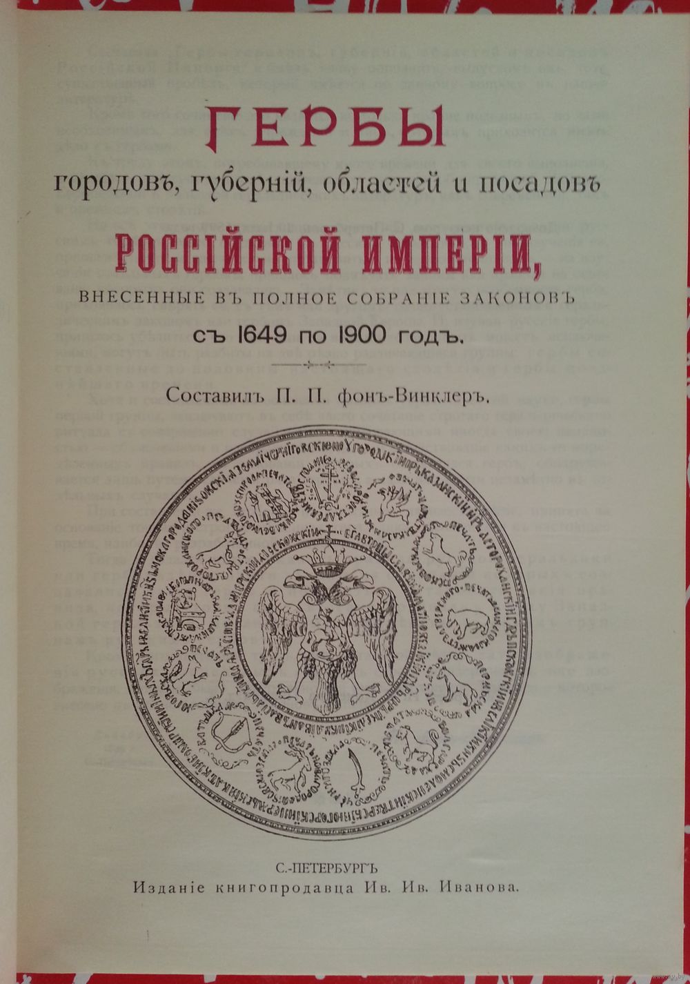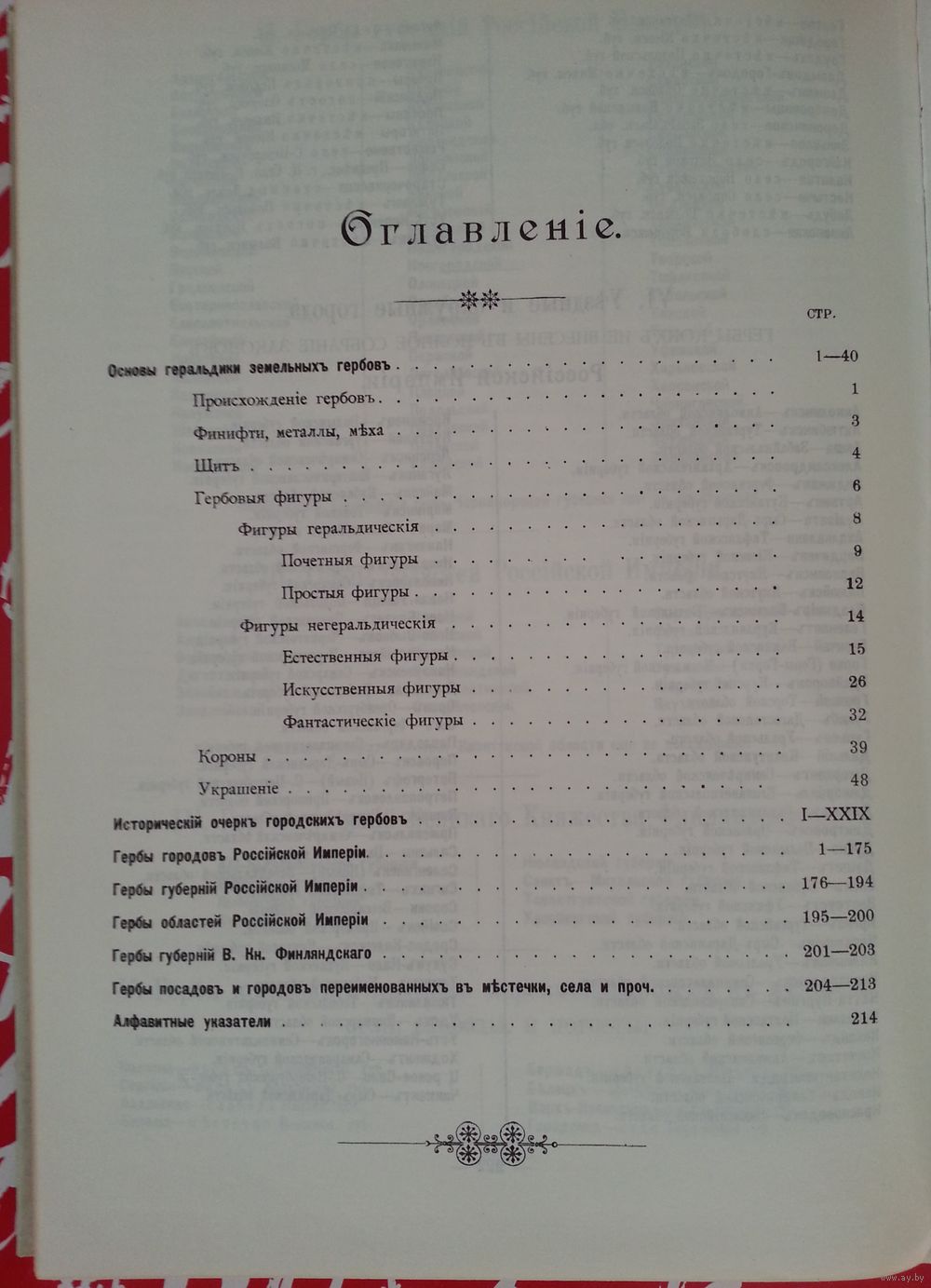 Репринтное воспроизведение издания 1899 года. Из предисловия автора: Составляя `Гербы городов, губерний, областей и посадов Российской Империи` я имел ввиду пополнить, выпуском их, тот существенный пробел, который имеется по данному вопросу в нашей литературе. Кроме того сочинение это является не только крайне полезным, но даже необходимым для всех учреждений и лиц, которым приходится иметь дело с гербами. К труду этому, потребовавшему много времени для своего выполнения, я решился приступить после тщательнаго изучения обширнейшей Западно-Европейской и польской геральдических литератур, как современной, так и прежних столетий. Но все эти, часто превосходные сочинения, мало соответствовали русским гербам, мало подходили к русской геральдики, и, для изучения ее, пришлось почти исключительно остановиться на первоисточниках - на изучении отдельных гербов; пришлось подмечать законы или правила на основании которых они создавались... Заметив ту или другую особенность герба, приходилось сверять ее, съ тем или другим точно-установленным геральдическим законом или гербом Западной Европы. И, изучая русские гербы, пришлось убедиться, что все они, за малыми только быть можетъ нсключениями, могутъ быть разбиты на две резко различающиеся группы: гербы составленные до половины настоящего столетия и гербы позднейшего времени. Хотя и составленные на основании правил геральдической науки, гербы первой группы, заключают въ себе часто сочетание строгого геральдического ритуала с совершенно случайными - поражающими иногда своей наивностью - объяснениями и изображениями; даже и существование каких-то определенных правил, на основании которых составлялся герб, обнаруживается лишь путем сличения ряда гербов, а мало или почти незаметно в отдельных случаях. При составлении-же гербов, в последнее пятидесятилетие, принята за основание точная и строгая немецкая геральдика, являющаяся в настоящее время, наиболее разработанной и законченной. Тогда я задался целью указать правила русской геральдики или гербоведения, найти законы, на основании которых создавались наши гербы и попытаться установить такие правила, которые точно соответствуя правиламъ и духу Западной геральдики, могли-бы быть применены к обеимъ группамъ русских гербов. Кроме того настоящий труд, имеетъ главной целью, дать изображения русских земельных гербов строго придерживаясь того изображения, которое было, утверждено для них Верховною Властью и которое внесено в полное собрание законов Империи