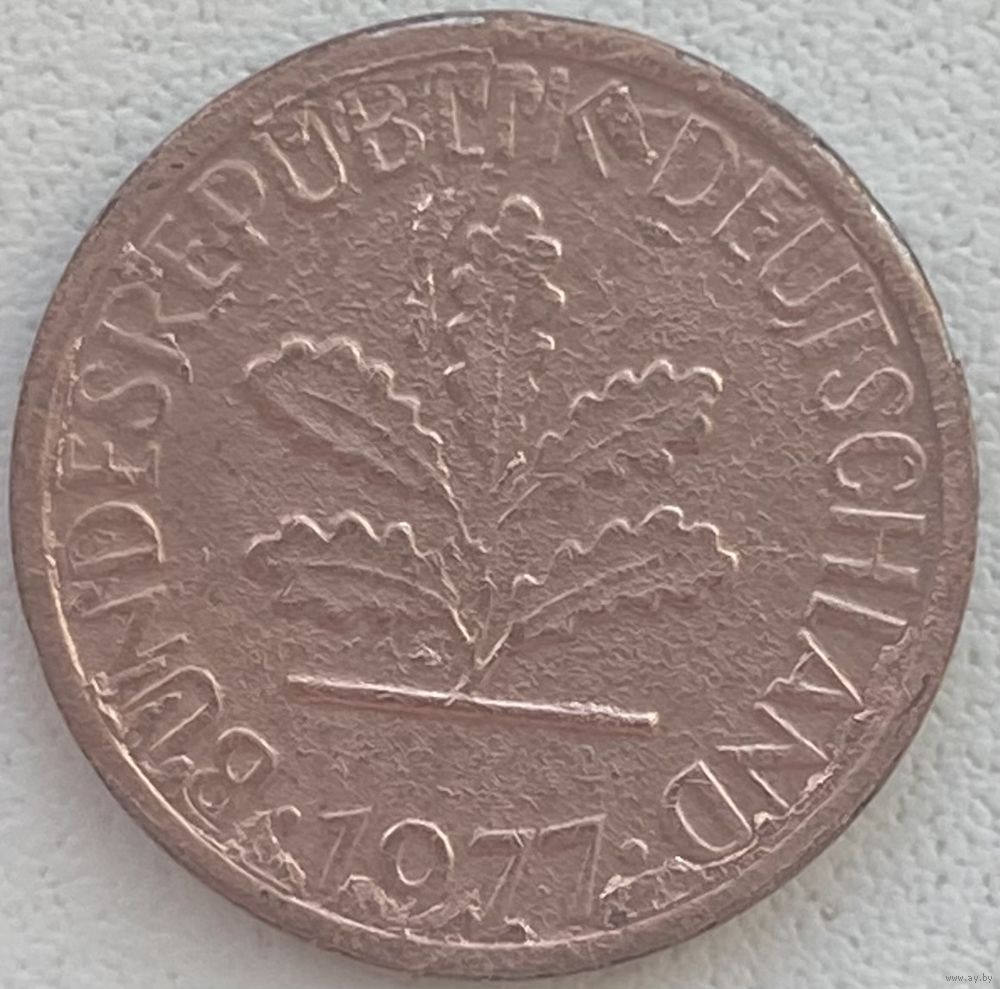 Германия 1 пфенниг 1977 г. G. Брак. Засорение штемпеля