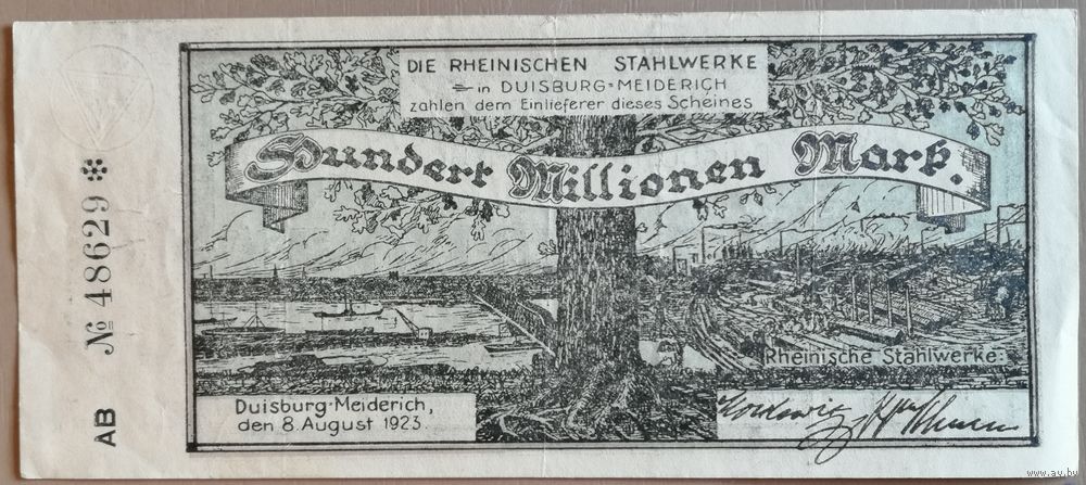 Германия 100 миллионов марок 1923 г Дуйсбург-Мейдерих (Duisburg-Meiderich), специальный выпуск рейнские сталеплавильные заводы -- ДЕДУШКИ современного -- "РЕЙН МЕТАЛЛ"