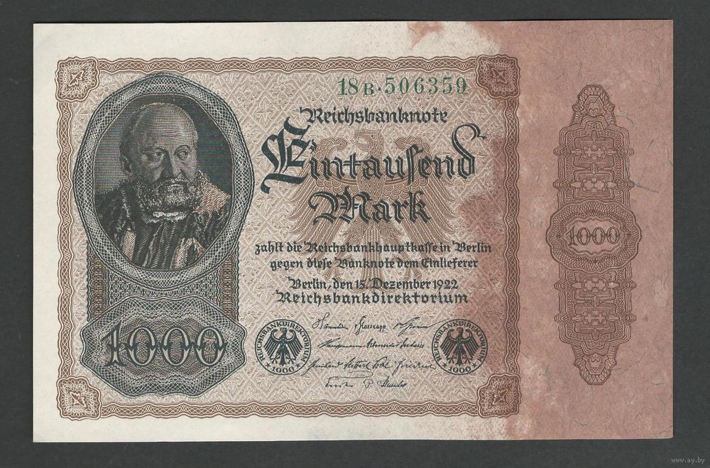 Германия 1000 марок 1922 года. Без надпечатки. Тип Р-82a. Состояние UNC-