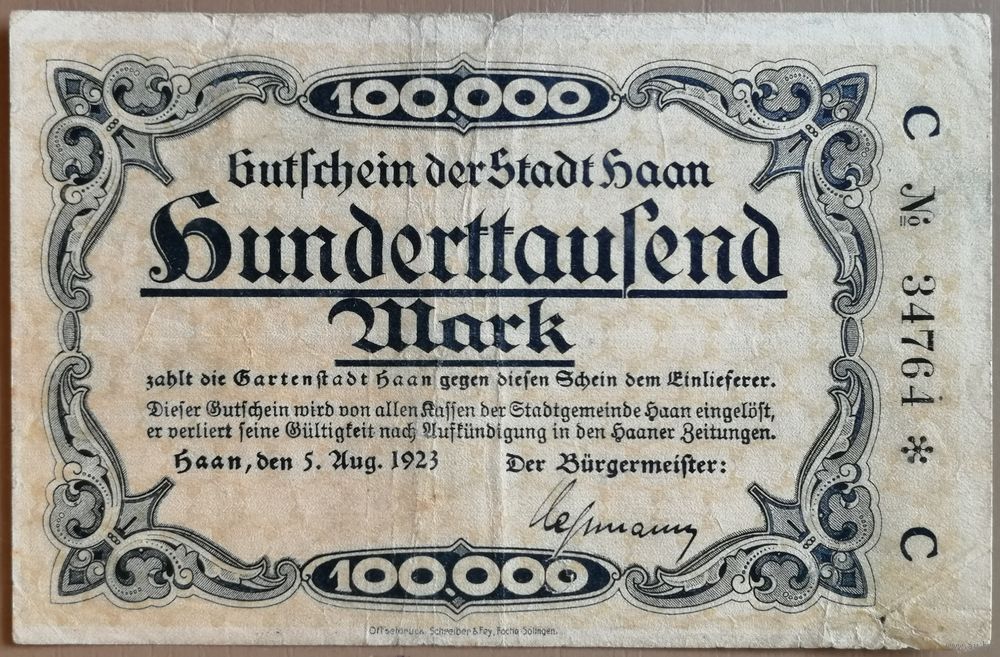 Германия 100000 марок 1923 г Хаан (Haan), 2031а, В7, серия "С" не частая