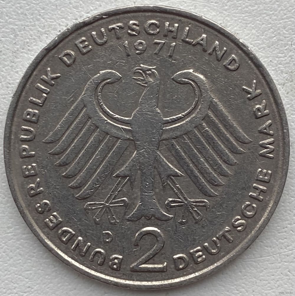 Германия 2 марки 1971 г. D. Теодор Хойс. 20 лет Федеративной Республике (1949-1969)