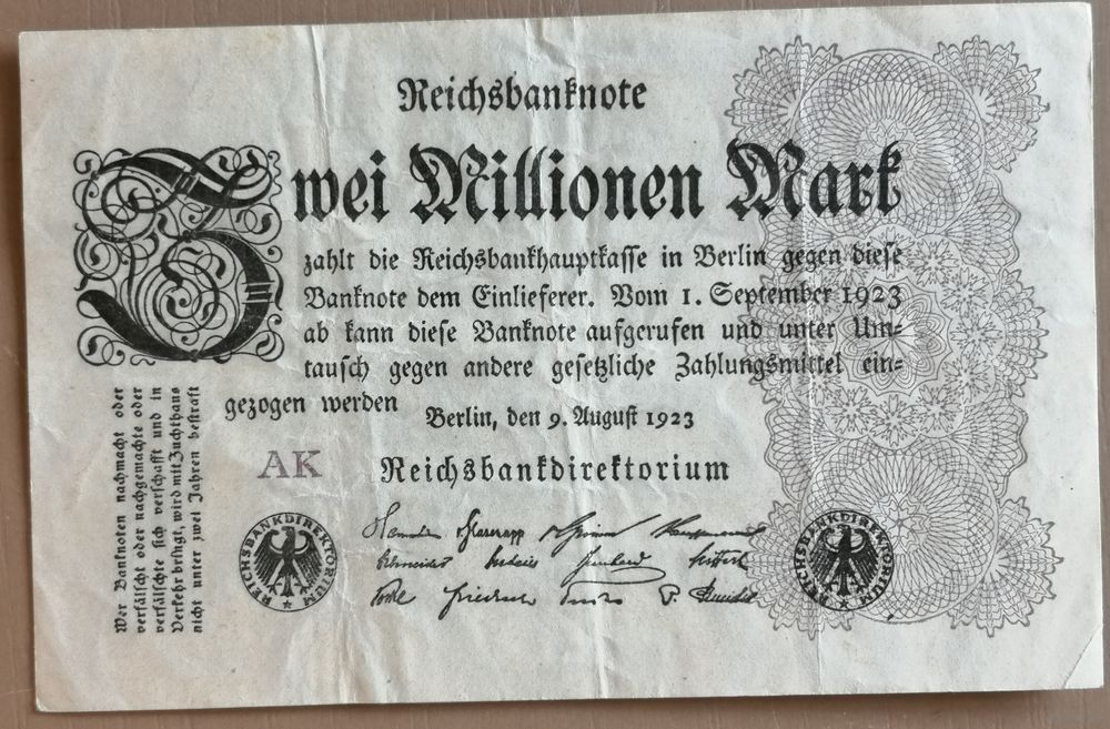 Германия 2 миллиона 2000000 марок 1923 год Ro.103b, DEU-116, ВЗ "крючки"
