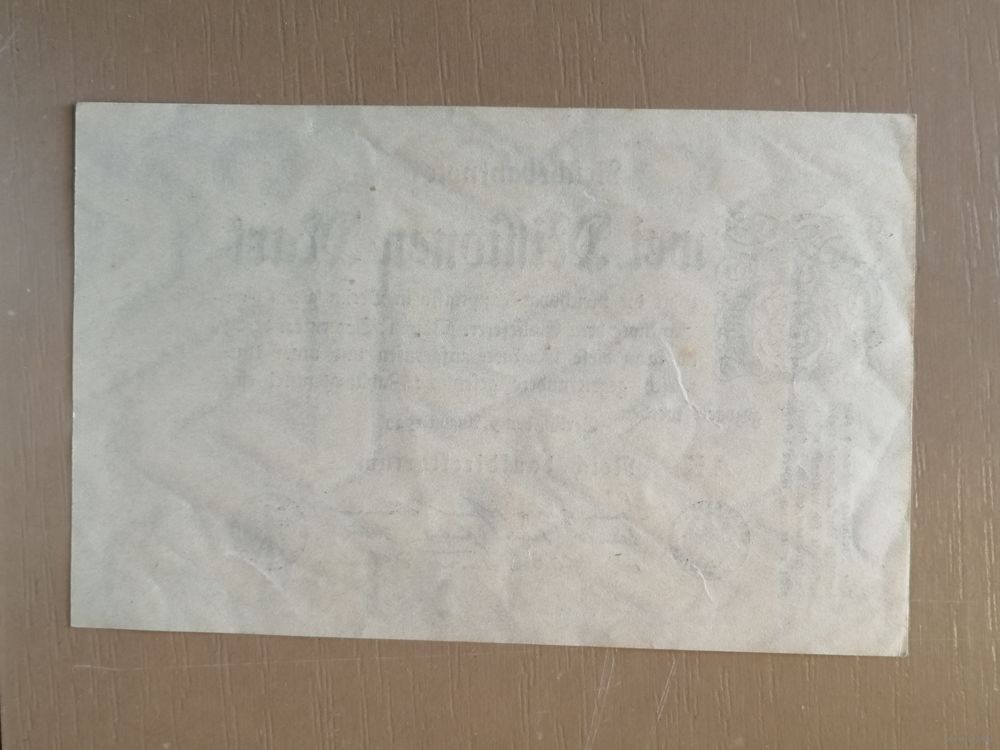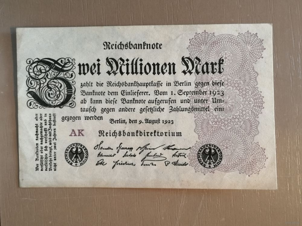 Германия, 2 миллиона марок, 1923 год, Reichsbanknote. 2 Millionen Mark. 9. August 1923. (Тип 2) Ro.103a DEU-116, в/з Hakenstern, FZ есть , водяной знак -- звезды с крючками/углами (125 х 80 мм)