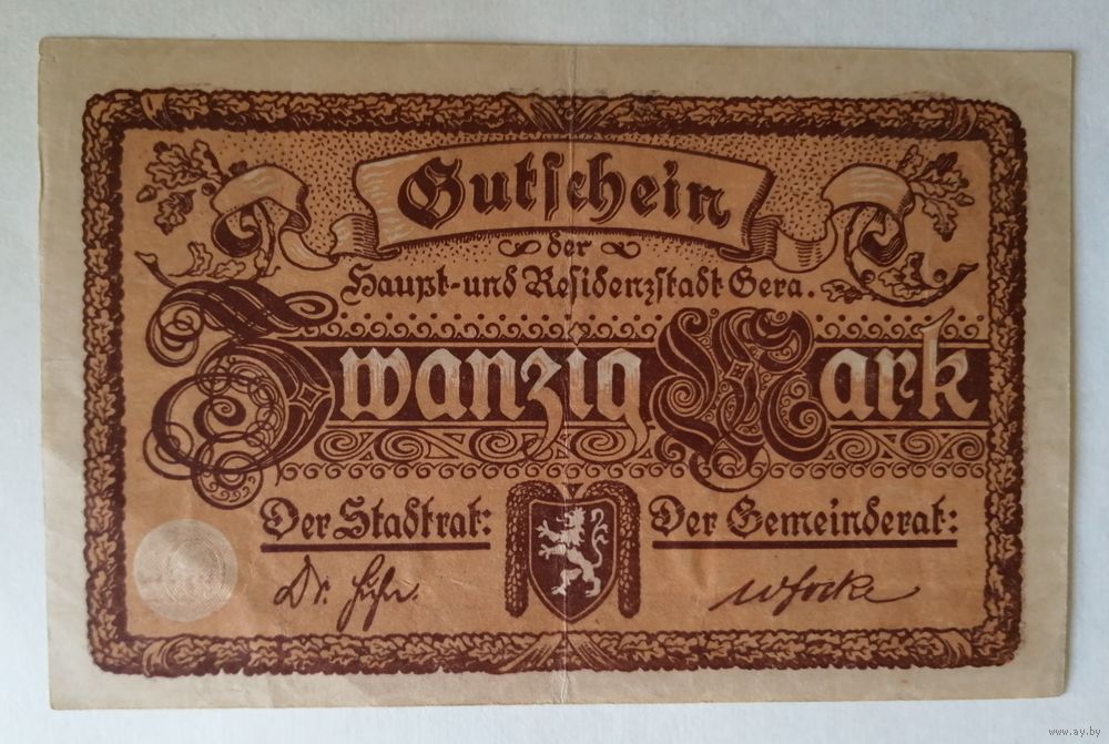 Германия 20 марок 1919 г Гера (Gera) Тисненая печать, XF, 172.04b