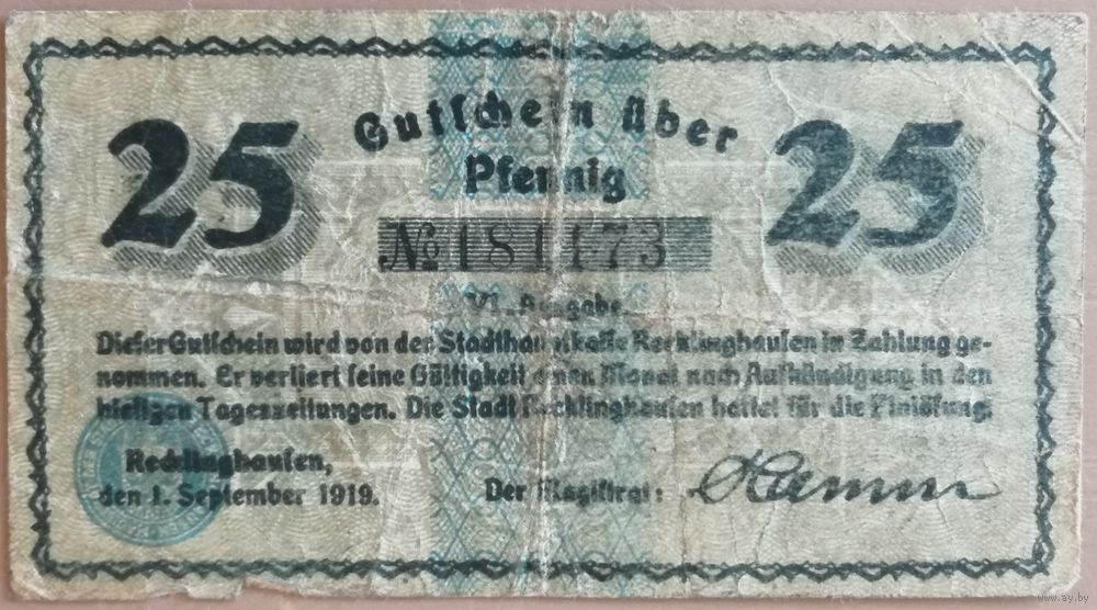 Германия 25 пфеннигов 1919 г Реклингхаузен, провинция Вестфален (Recklinghausen) F...F+