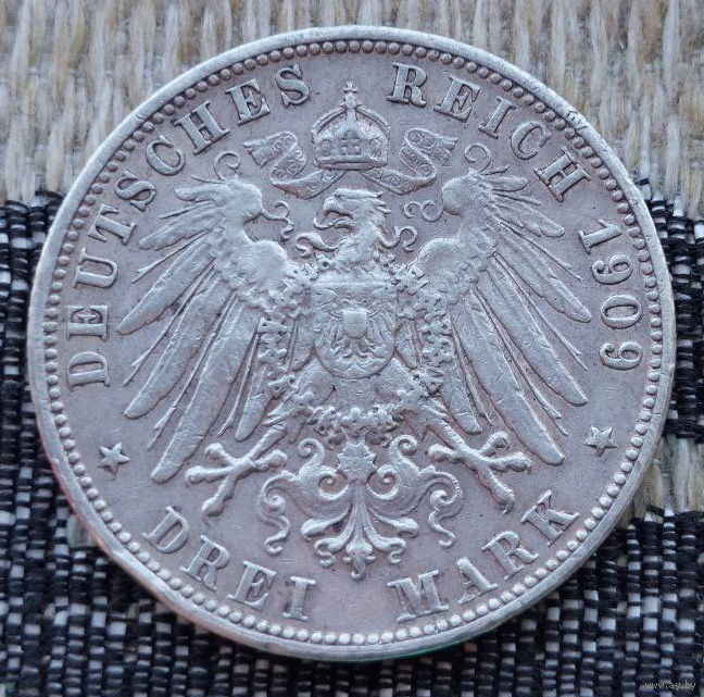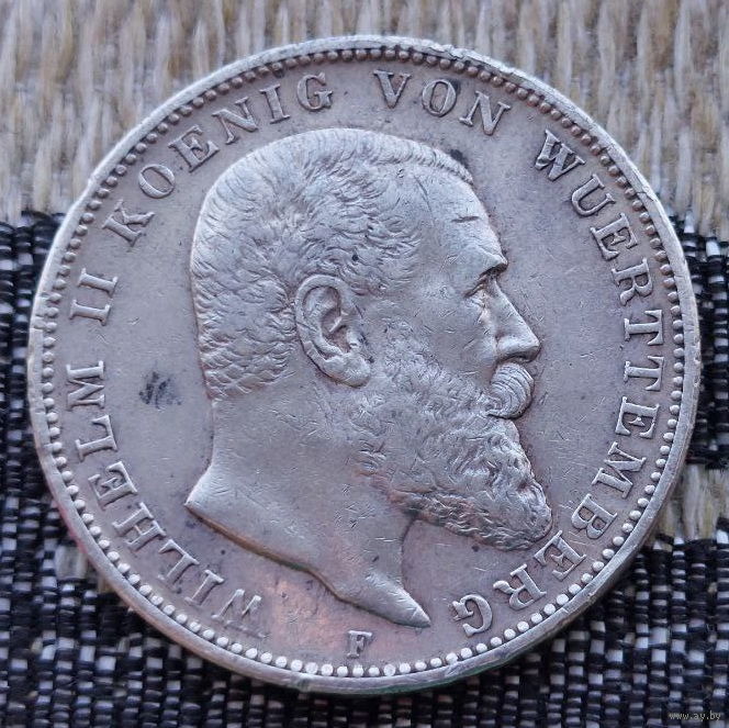 Германия 3 марки 1909 года, F. Вильгельм II Вюртембергский. Серебро! Сторгуй за свою цену, предложи обмен! S120