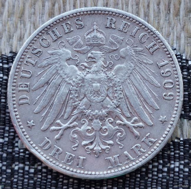 Германия 3 марки 1909 года, F. Вильгельм II Вюртембергский. Серебро! Сторгуй за свою цену, предложи обмен! Y