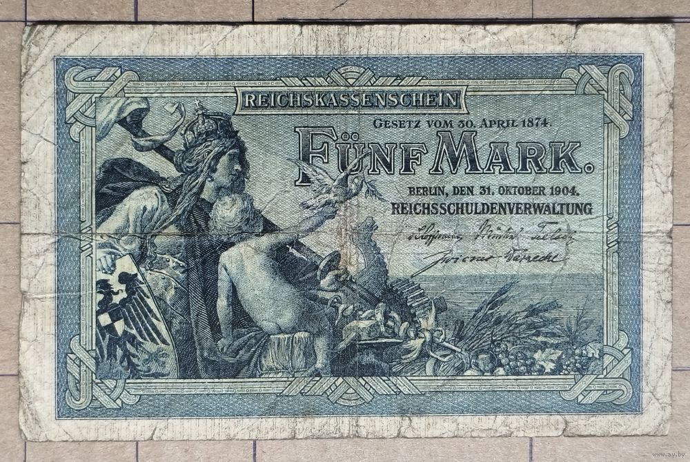 Композиция из персонификация Германии (*1) с имперским щитом, копьем, младенец с голубем мира, предметы символизирующие сельское хозяйство, индустрию, мореходство (шестерни, колосья, нос корабля, молот, наковальня, жезл Меркурия). Наименование знака - Reichskassenschein. Ссылка на имперский закон Gesetz vom 30. April 1874. Номинал знака FÜNF MARK. Текст - Berlin, den 31. Oktober 1904. Reichsschuldenverwaltung. Подписи. Преобладающий цвет сине-зеленый.
