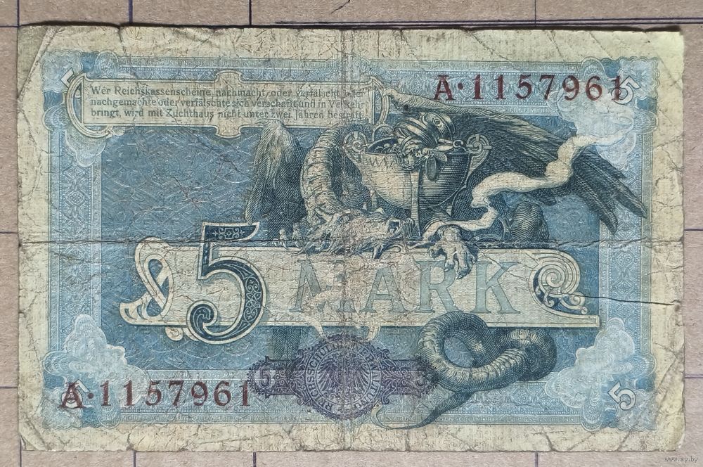 Дракон охраняющий чашу с сокровищами. Крупная надпись номинала - 5 MARK. Текст предупреждающий о наказании за подделку кассовых знаков - "Wer Reichskassenscheine nachmacht oder verfälscht oder nachgemachte oder verfälschte sich verschafft und in Verkehr bringt wird mit Zuchthaus nicht unter zwei Jahren bestraft". Серийные номера. Печать. Преобладающий цвет сине-зеленый.