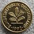 Номер KM # 107 Страна Германия Период Федеративная Республика (1990 - 2001) Валюта Немецкая марка Вид чекана Регулярный чекан Номинал 5 пфеннигов Год 1950 - 2001 Гурт Гладкий Форма Круг Отношение авс/рев Медальное (0°) Материал Сталь с латунным покрытием Вес (g) 3 Диаметр (mm) 18,5 Толщина (mm) 1,7