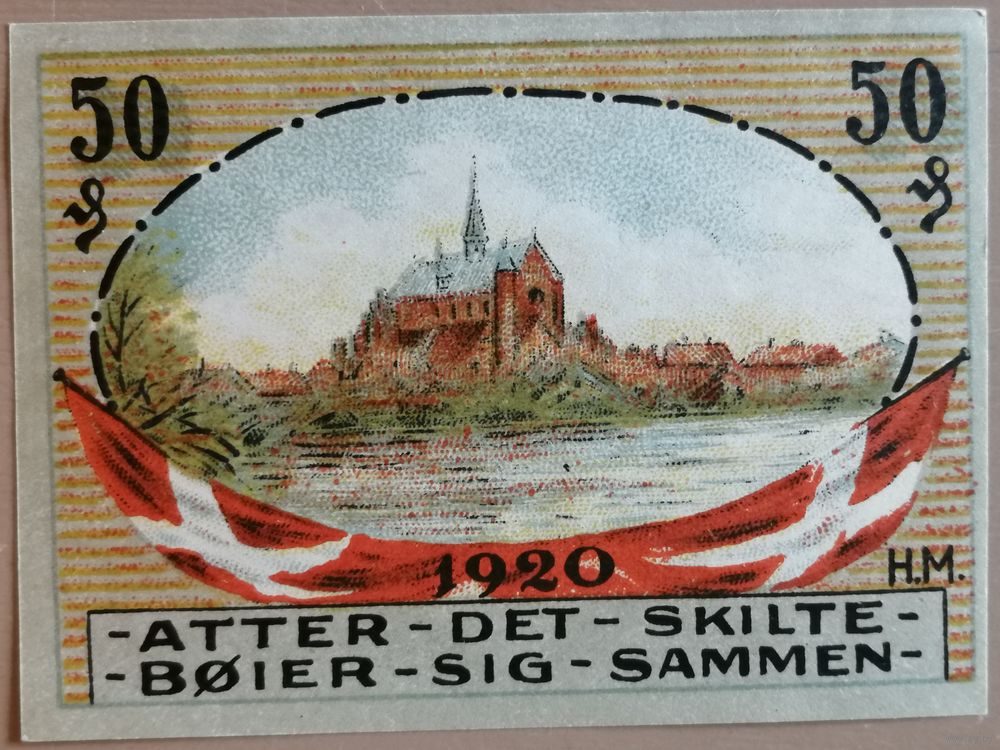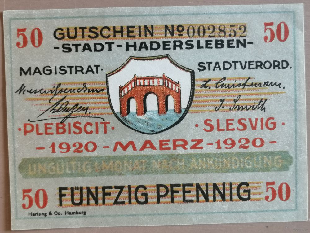 Германия 50 пфеннигов 1920 г Хадерслебен (Hadersleben) H1.6, B5, aUNC