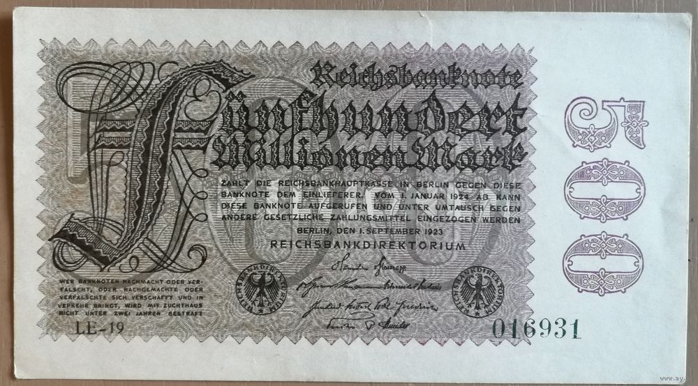 Эмиссии Рейхсбанка (Reichsbank) Германского государства. Имперские банкноты выпуск 1 сентября 1923 г. Банкноты поступили в обращение в сентябре 1923 год. Имперские банкноты выпуска 1-го сентября 1923 года изъяты из обращения 05.07.1925 г.
