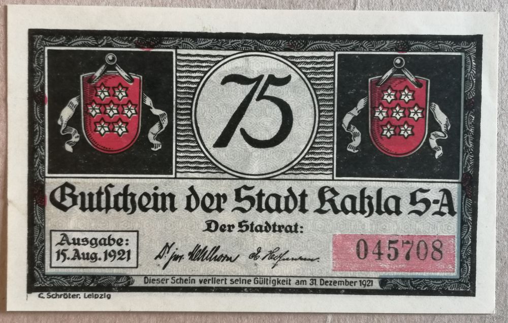 ермания 75 пфеннигов 1921 г Кала (Kahla) P# 668.2a, aUNC, В/З