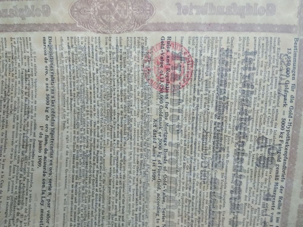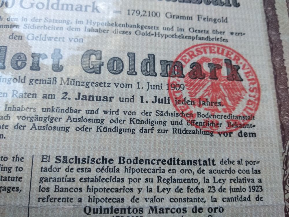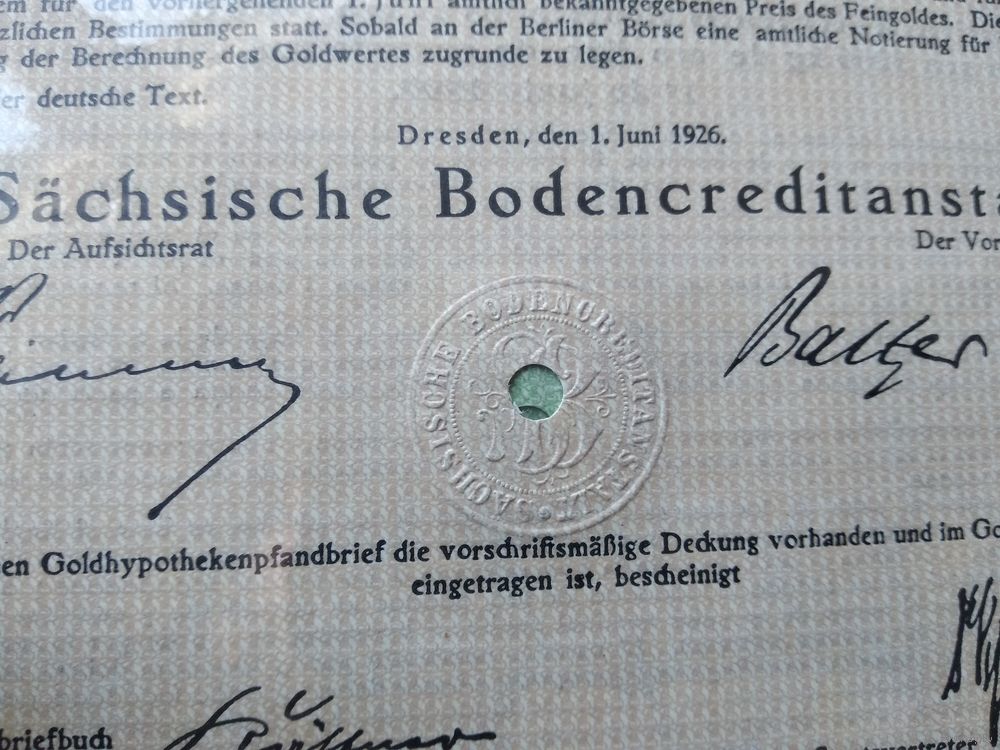 Германия, Дрезден 1926, Залоговое письмо, Облигация, 500 Голдмарок -8%, Водяные знаки, Тиснение. Размер - А4