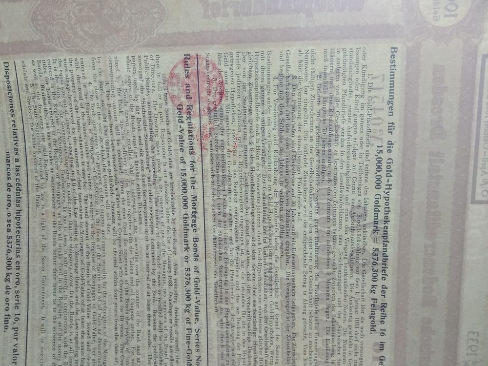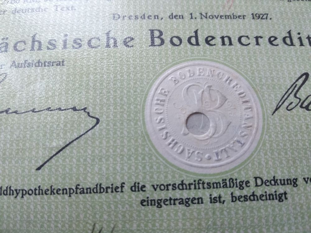 Германия, Дрезден 1927, Залоговое письмо, Облигация, 1000 Голдмарок -8%, Водяные знаки, Тиснение. Размер - А4