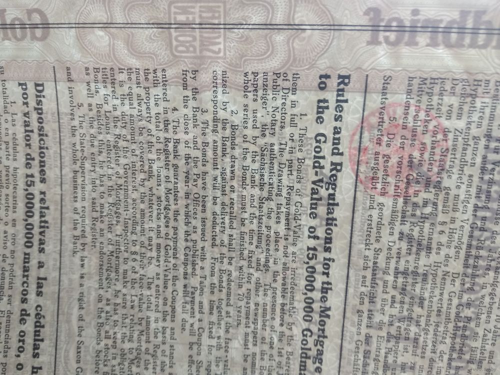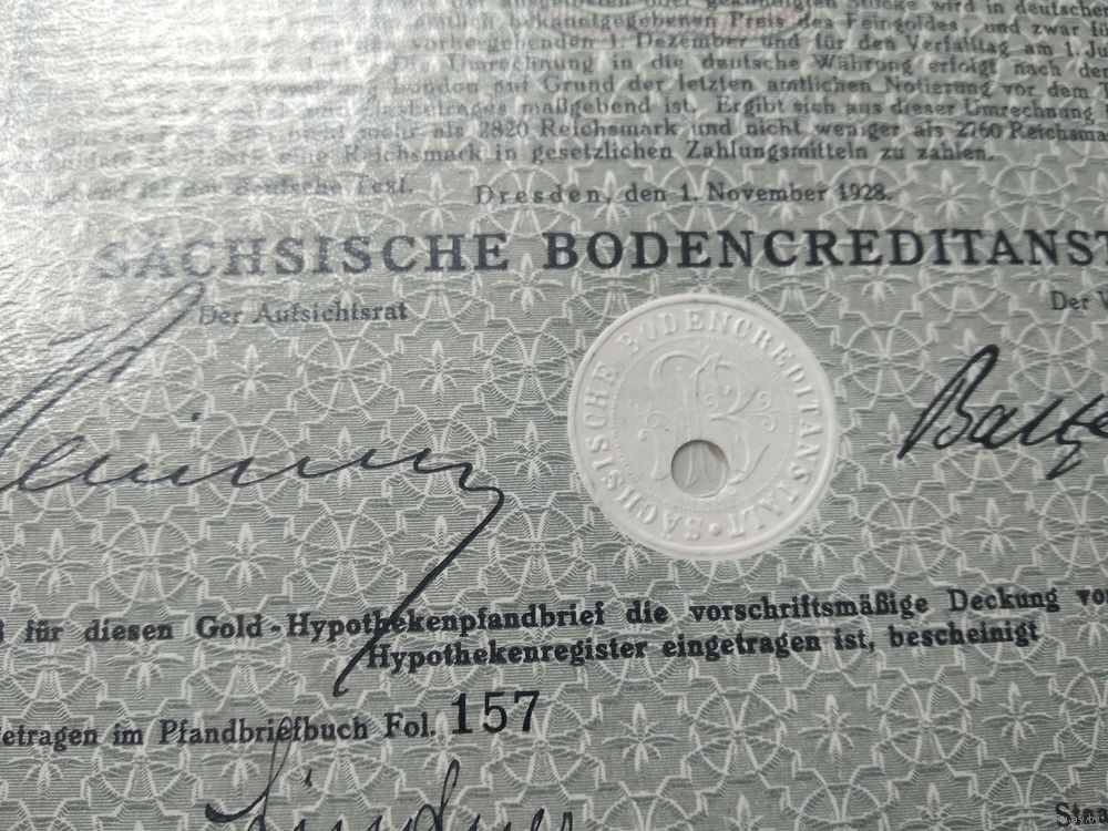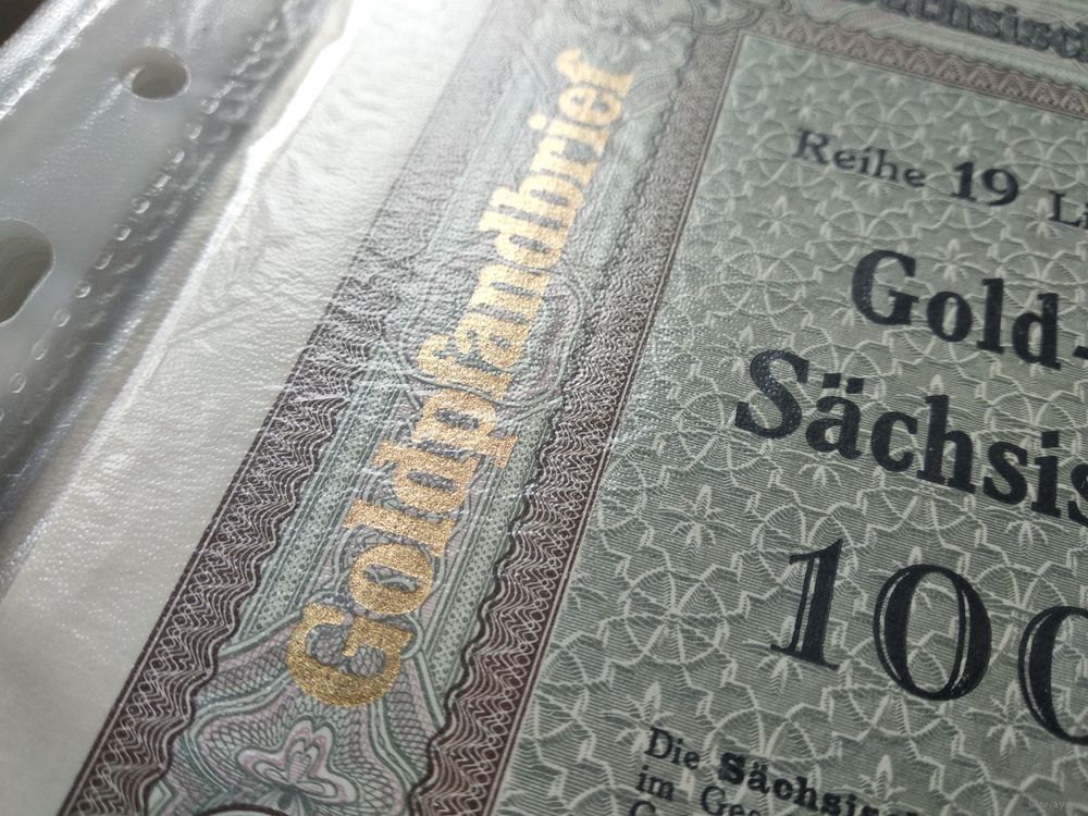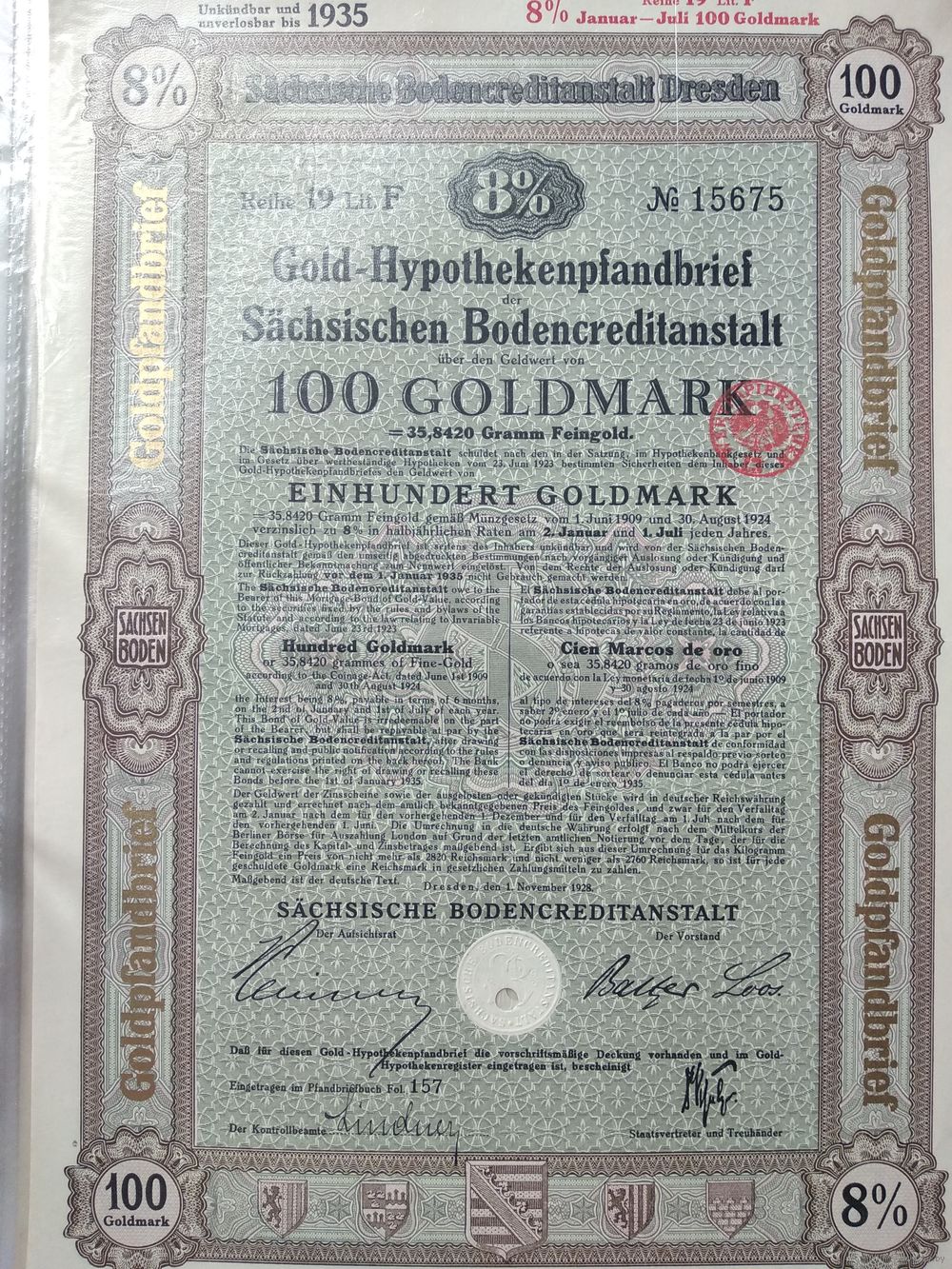 Германия, Дрезден 1928, Облигация, 100 Голдмарок -8%, Водяные знаки, Тиснение. Размер - А4