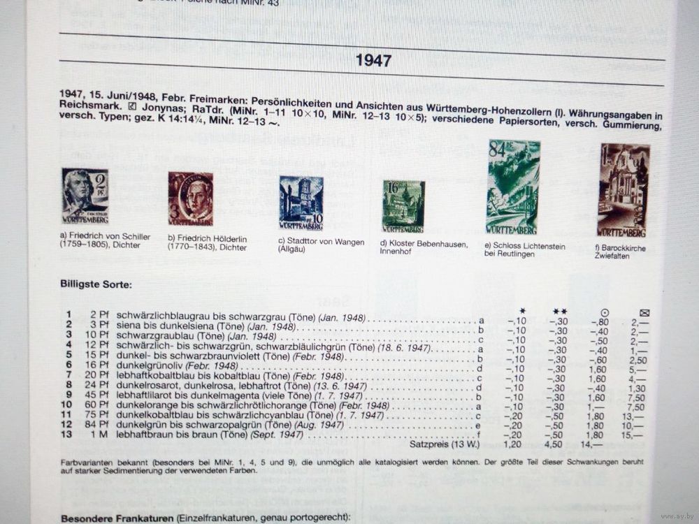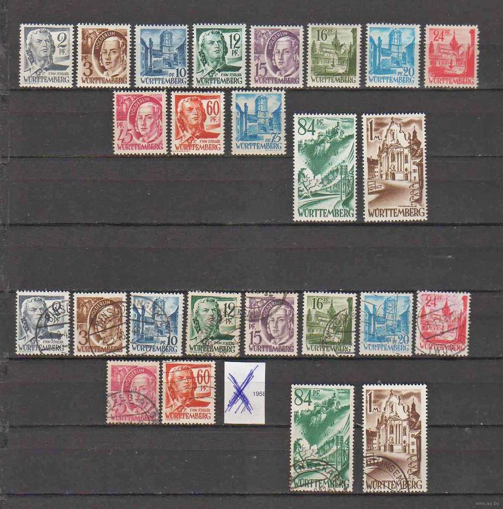 Германия.Французская зона оккупации (Вюртенбург).Стандарт 1947 ! ПОЛНАЯ серия в вариантах! Чистая(без наклеек ,с родным клеем) и гашеная(без одной марки) !