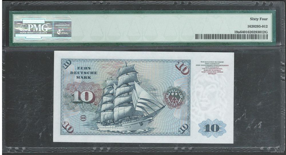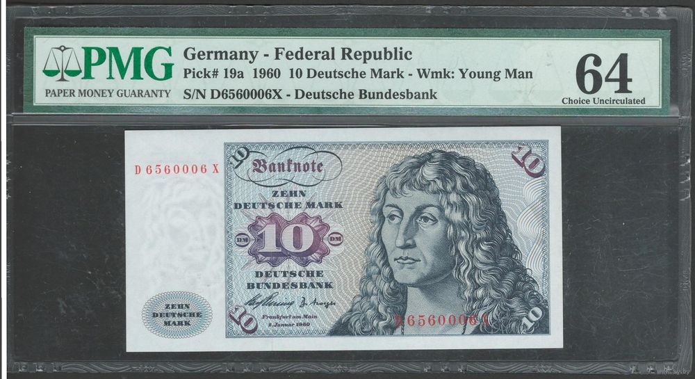 Германия ФРГ 10 марок 1960 года. Тип P-19а. Состояние UNC! В слабе PMG 64