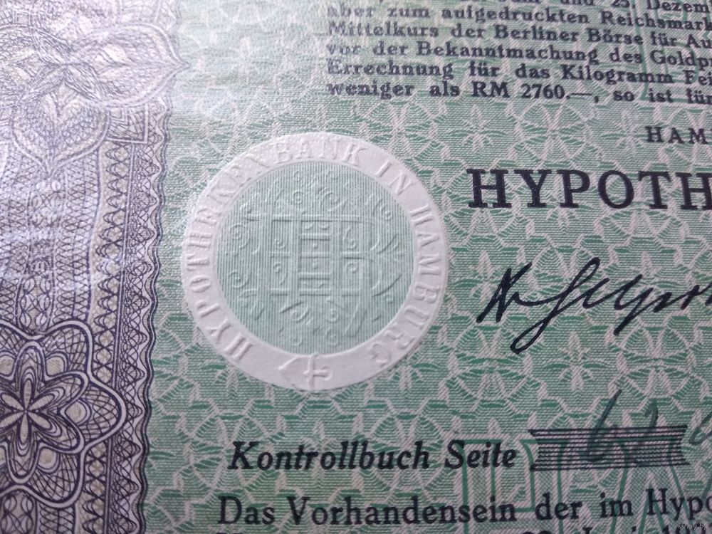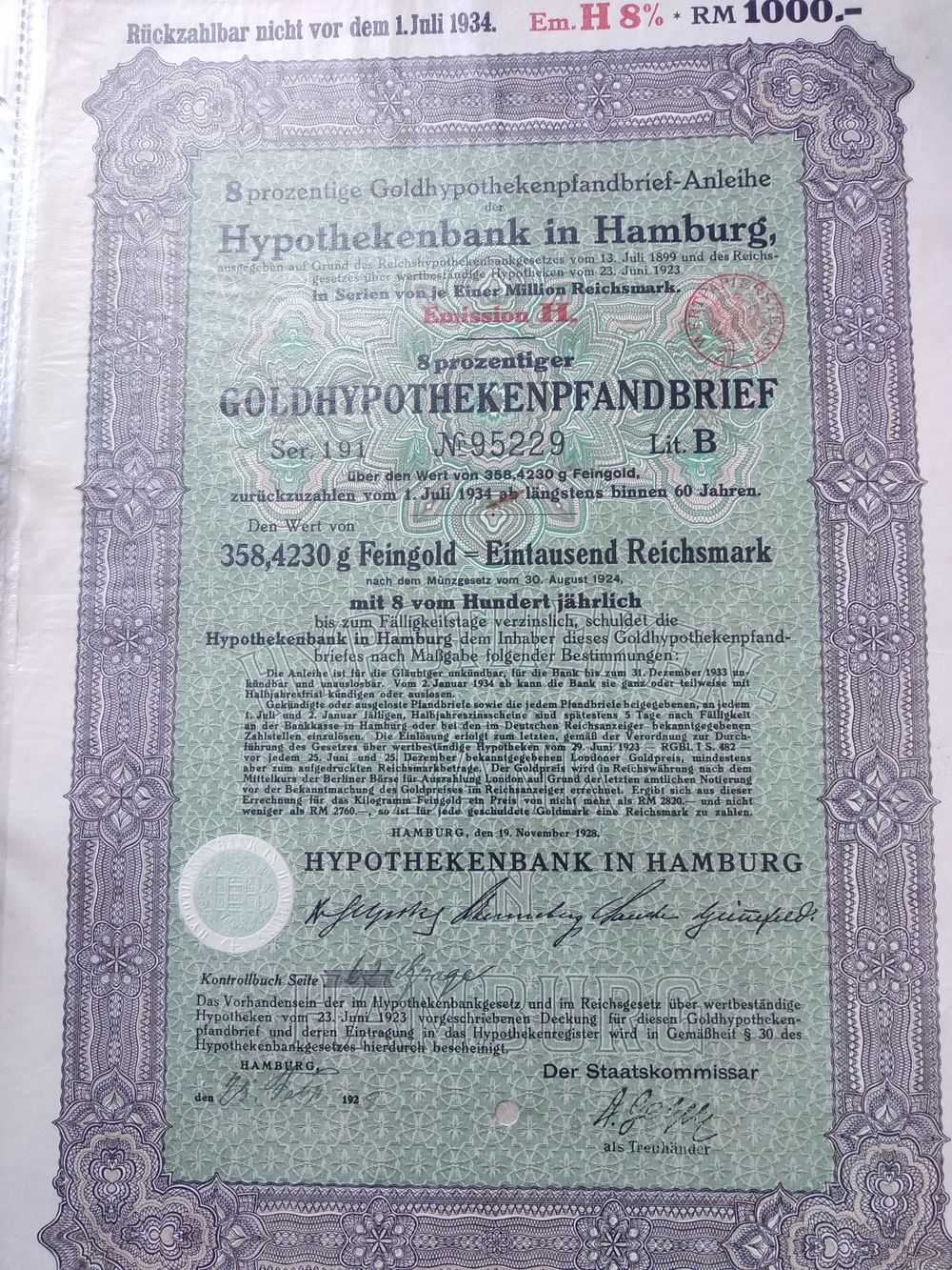 Германия, Гамбург 1928, Облигация, 1000 Голдмарок -8%, Водяные знаки, Тиснение. Размер - А4
