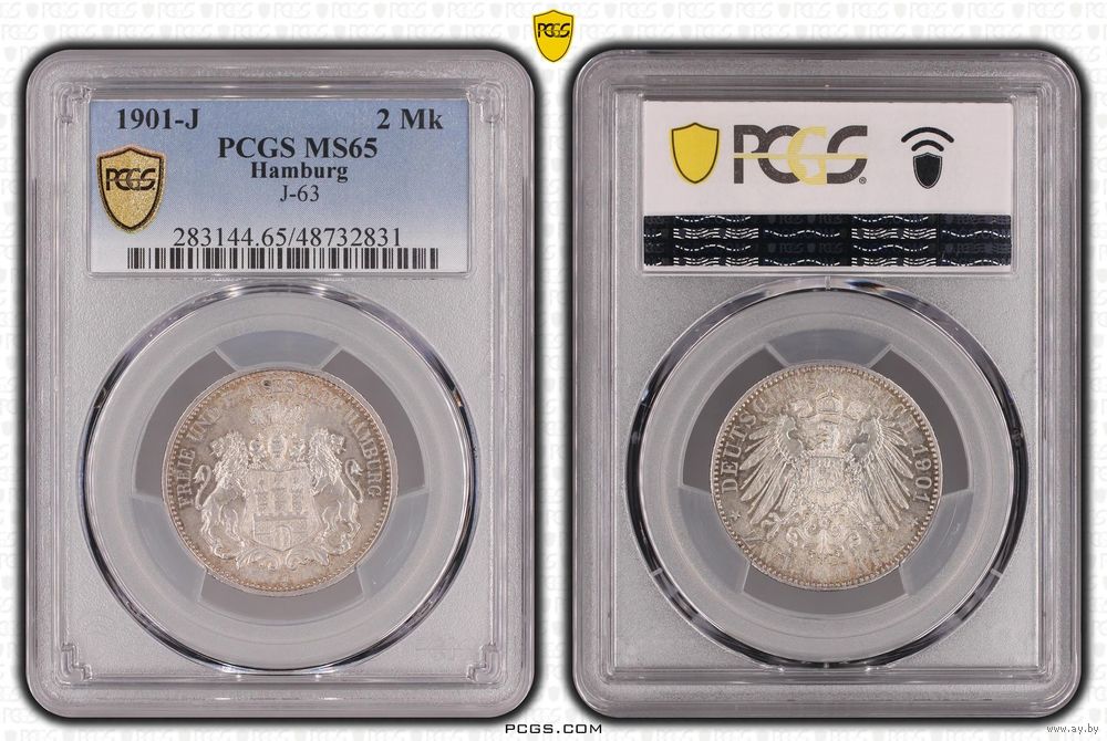 Германия.Гамбург. 2 марки 1901 J. слаб PCGS MS65