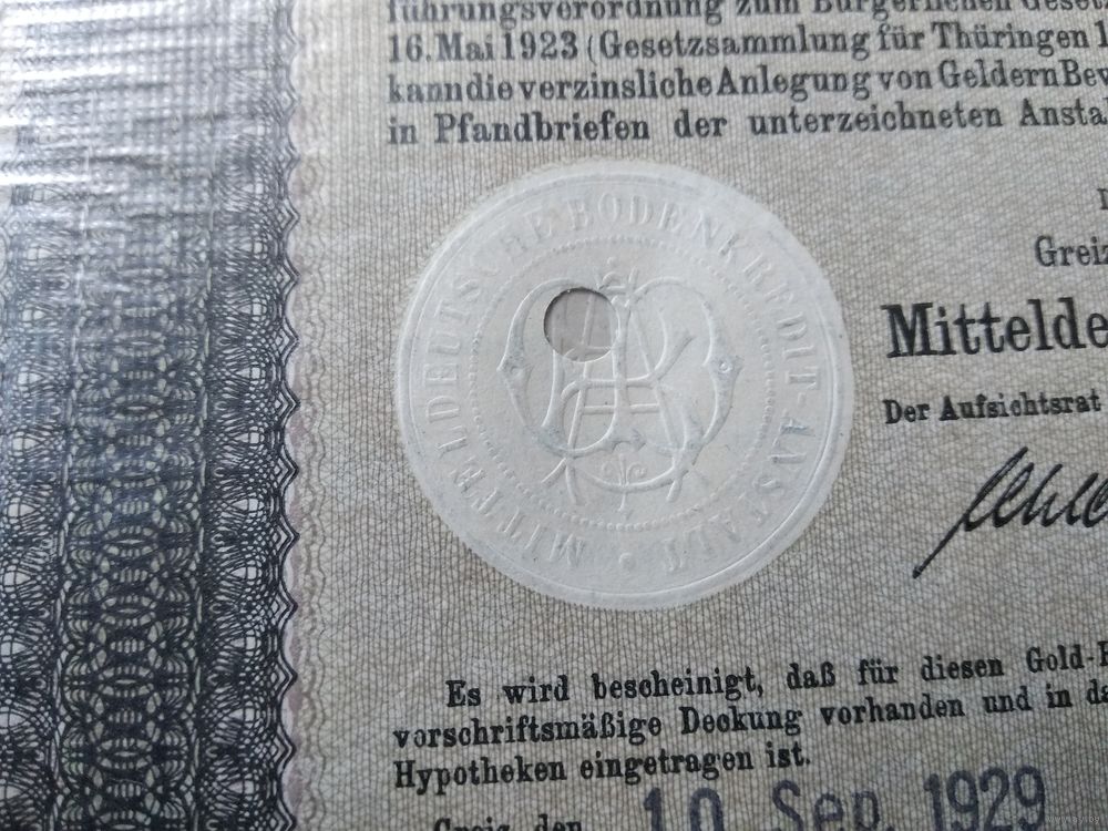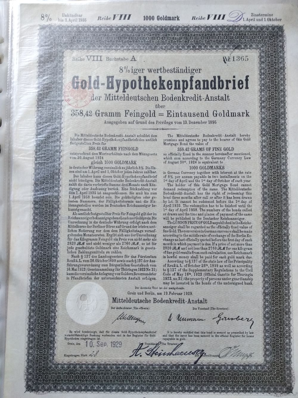 Германия, Грейц и Берлин 1929, Облигации, 1000 Голдмарок -8%, Водяные знаки, Тиснение. Размер - А4