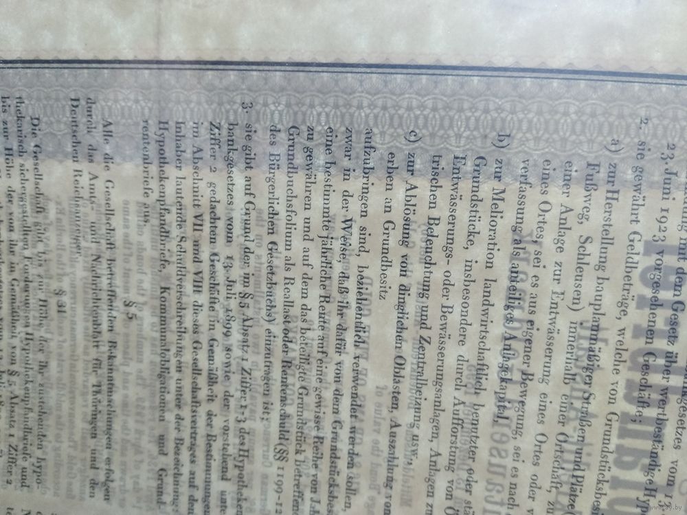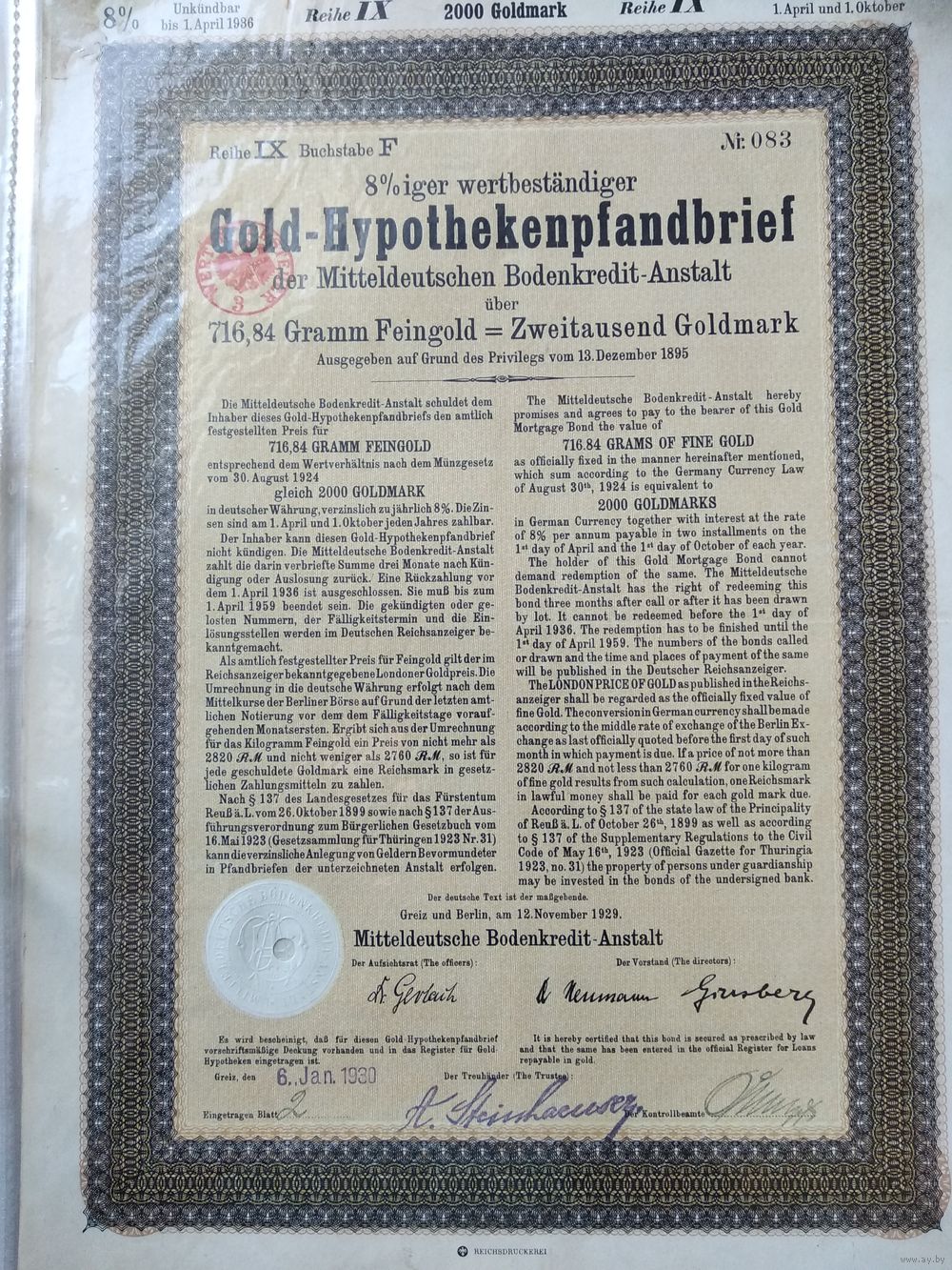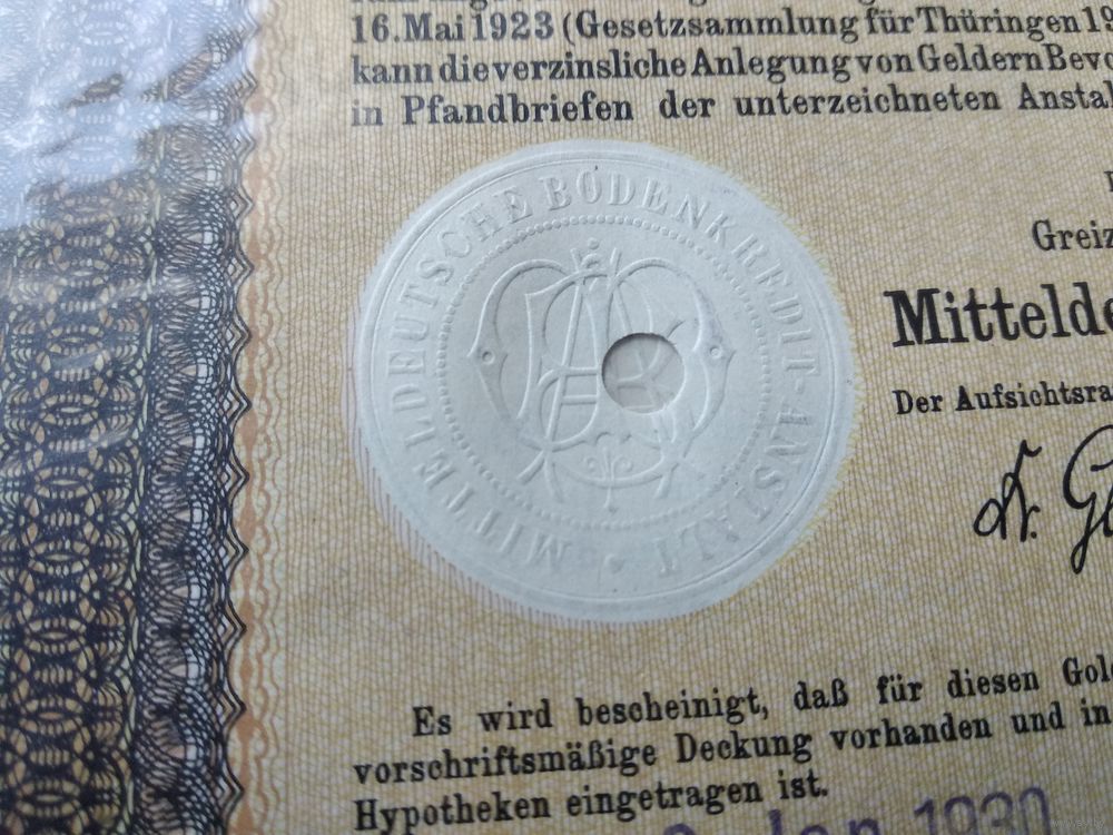 Германия, Грейц и Берлин 1929, Облигации, 2000 Голдмарок -8%, Водяные знаки, Тиснение. Размер - А4