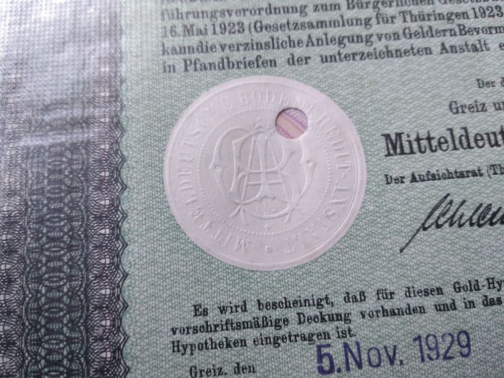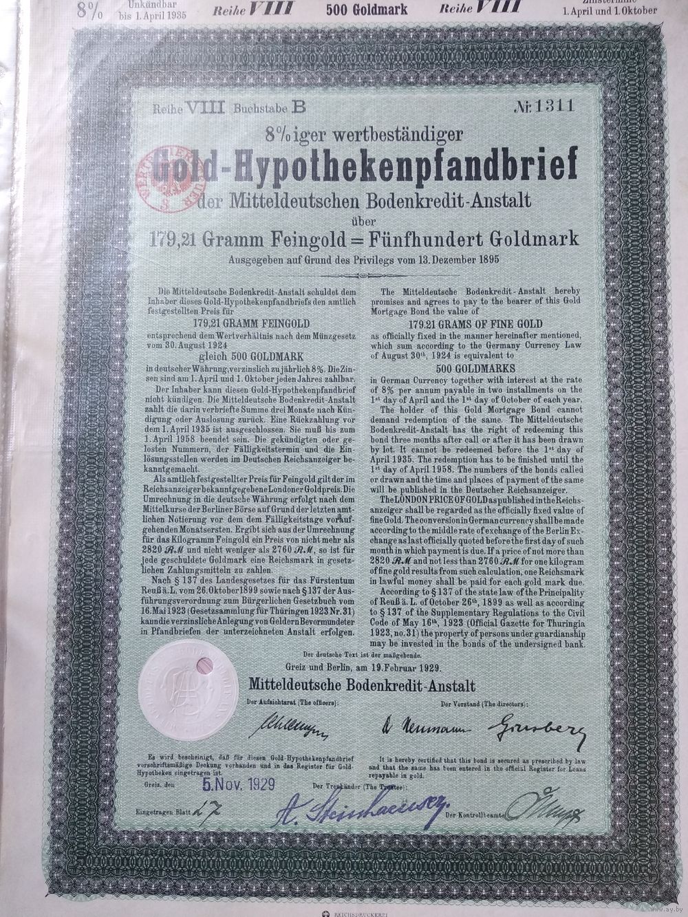 Германия, Грейц и Берлин 1929, Облигации, 500 Голдмарок -8%, Водяные знаки, Тиснение. Размер - А4