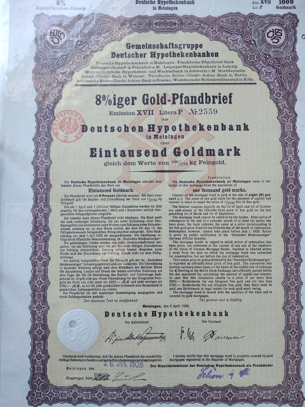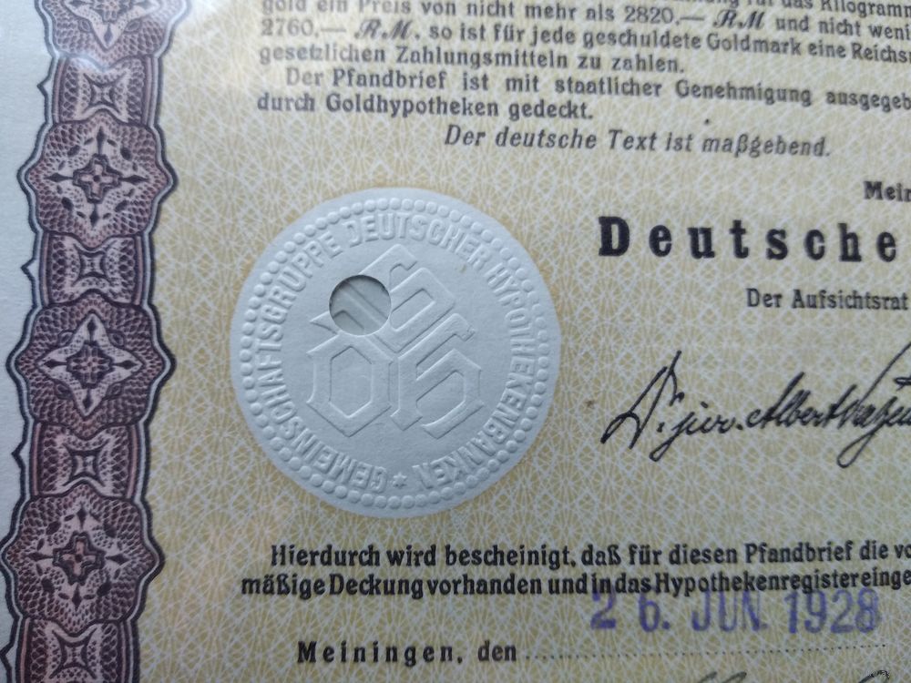 Германия, Майнинген 1928, Ипотечная Облигация, 1000 Голдмарок -8%, Водяные знаки, Тиснение. Размер - А4