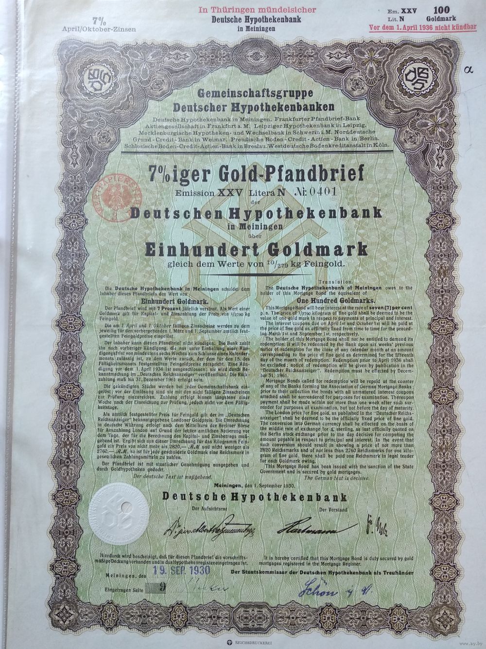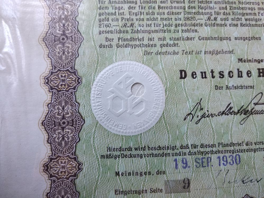 Германия, Майнинген 1930, Ипотечная Облигация, 100 Голдмарок -7%, Водяные знаки, Тиснение. Размер - А4