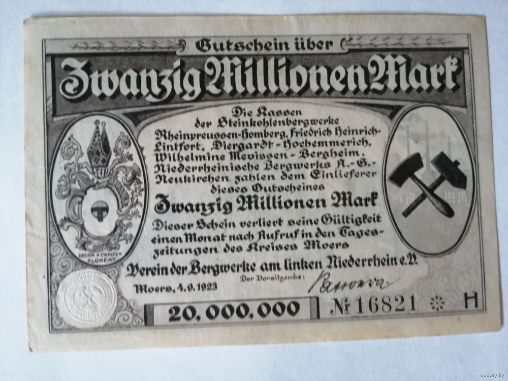 Ваучер на 20 миллионов марок ассоциации горнодобывающей промышленности левого берега Нижнего Рейна